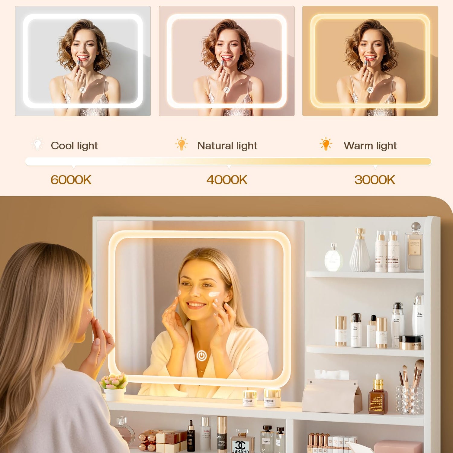 • 【Customizable Brightness &Efficient and Energy-Saving】Makeup Vanity comes equipped with LED strip that offer three distinct lighting modes: warm, natural, and cool, this LED strip provide stepless brightness adjustment , providing precise control over your illumination needs.
