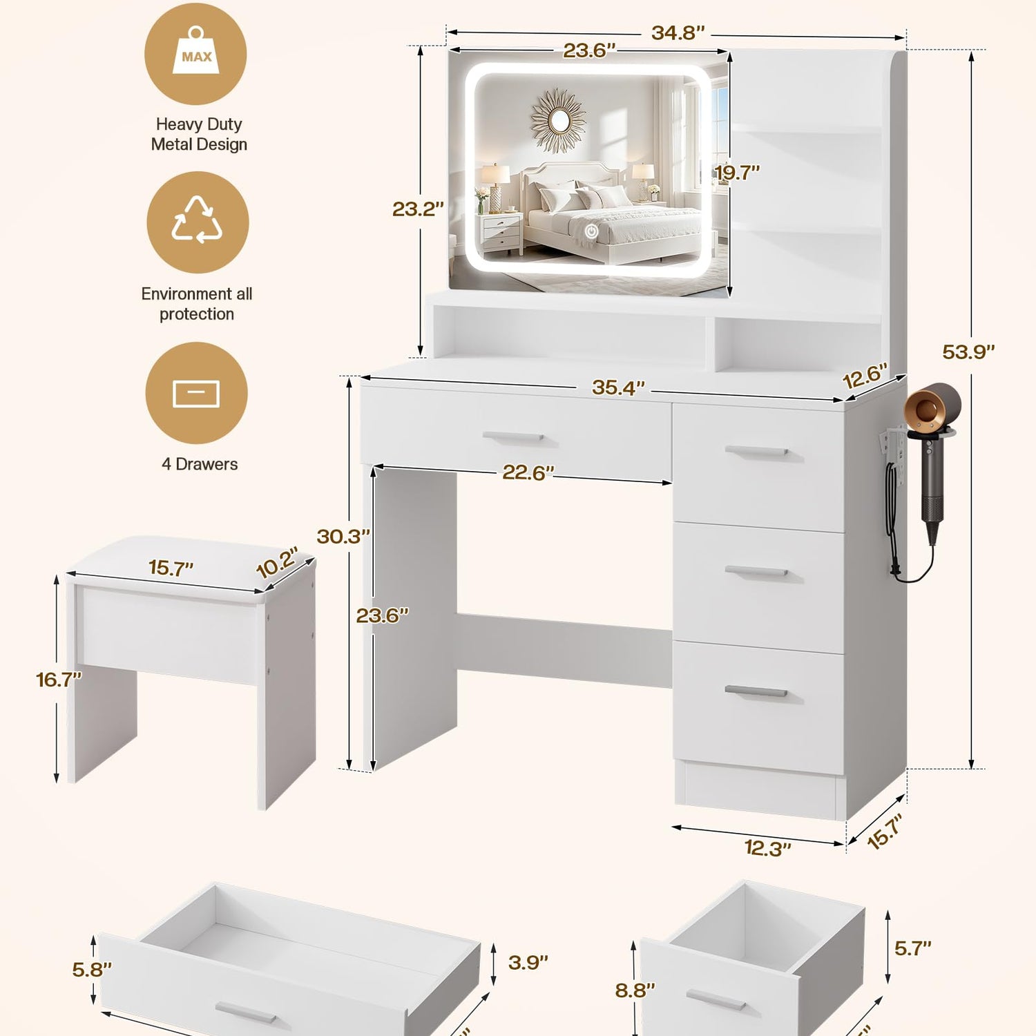 • 【Why choose LIVELYGLOW?】: Makeup Table measures 15.7'D x 35.4''W x 53.9''H, providing a space-efficient and compact solution for your beauty and grooming needs. LIVELYGLOW makeup vanity includes 3 small drawers and 1 large drawer, 5 desktop storage spaces providing ample space for organizing all your cosmetics, skincare products, jewelry, hair straighteners and hairdryers.