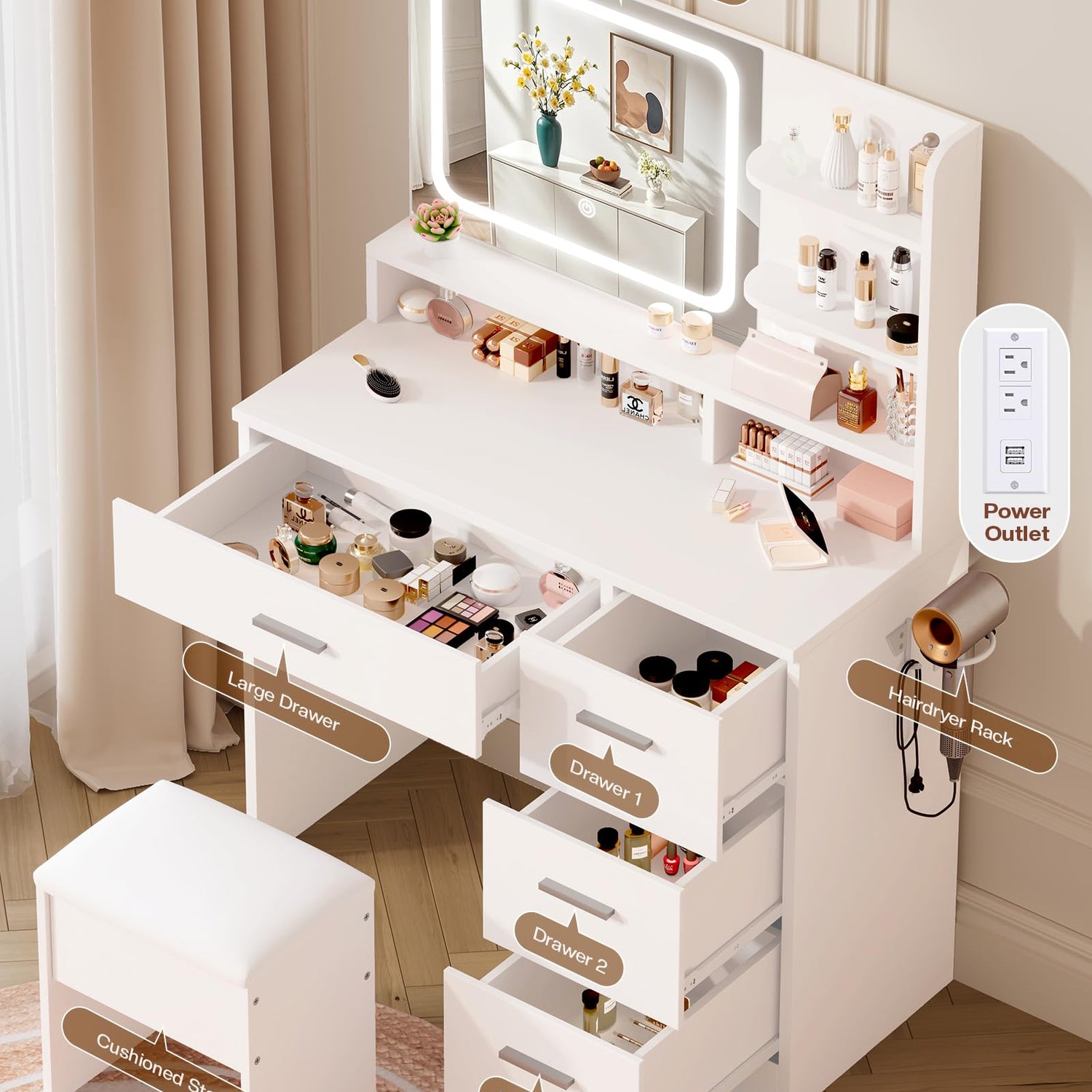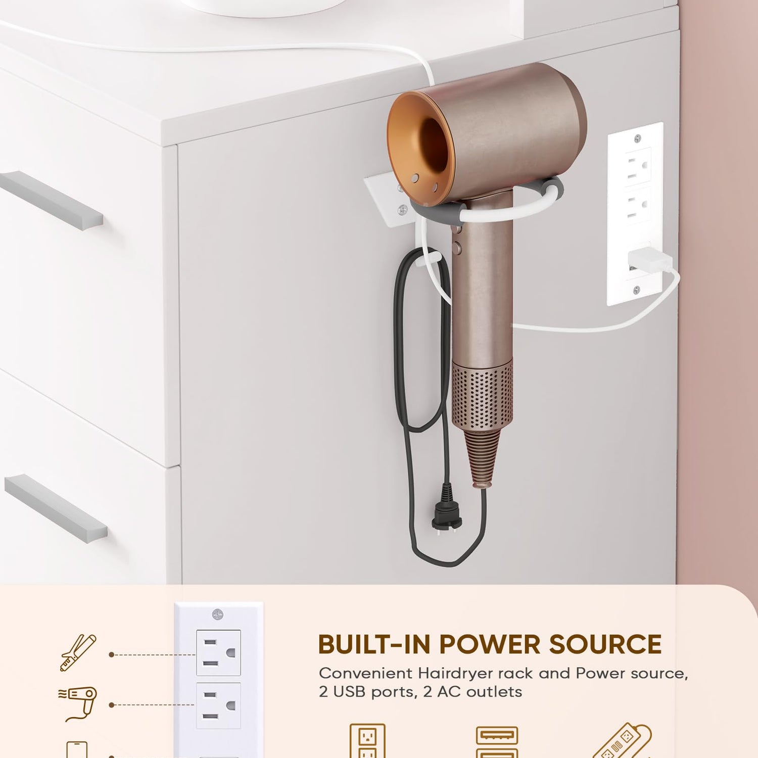 • 【POWER OUTLET & HAIRDRYER RACK】 LIVELYGLOW Makeup Vanity with lights include a built-in power outlet (With 2 AC outlets, 2 USB ports) convenient for charging your hair dryer, mobile phone and fill light, etc. And our vanity also equiped a hairdryer rack to keep your hairdryer.