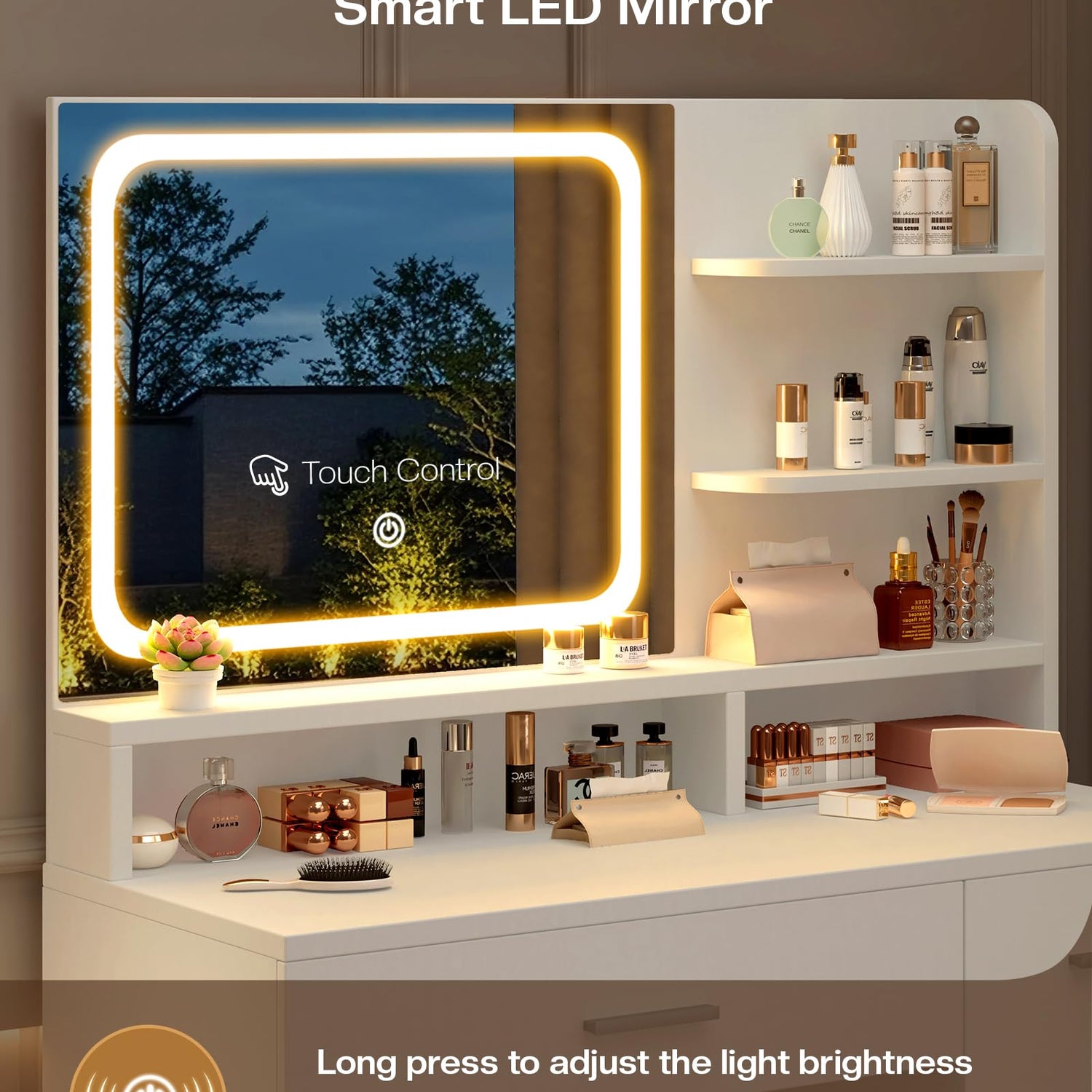 • 【Smart LED Mirror】 LIVELYGOLW vanity desk comes with a smart LED mirror, which can reflect a more realistic environment you are in, and can better show your beauty.