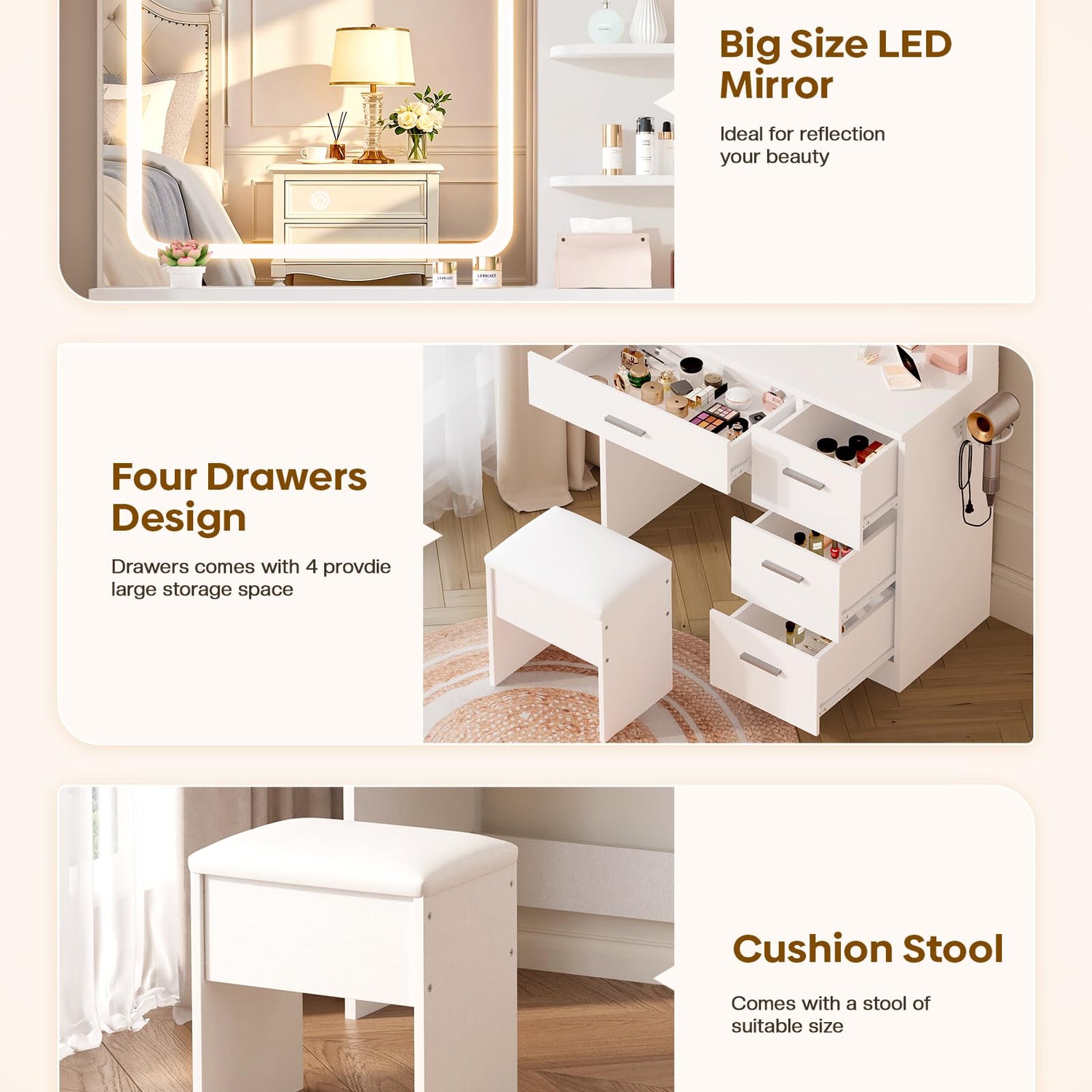 • 【More scientific space design】 Considering the dressing environment, LIVELYGLOW Makeup vanity desk adopts a more reasonable size design so that it can be conveniently placed in various rooms and locations in the home.
