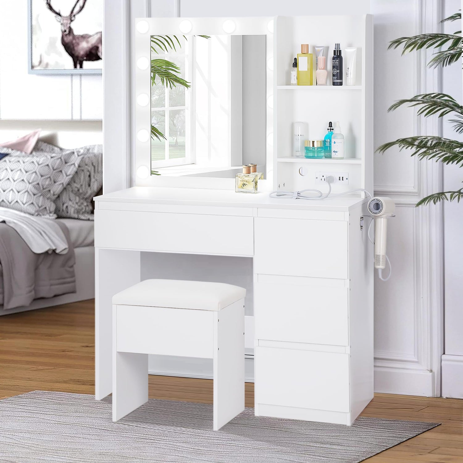 Lynxor Vanity Desk with Mirror and 12 LED Lights, Makeup Vanity Table with USB & Power Outlets, Spacious Storage Drawers, Shelves, and Cushioned Stool, Perfect for Bedroom, Hairdryer Holder, White