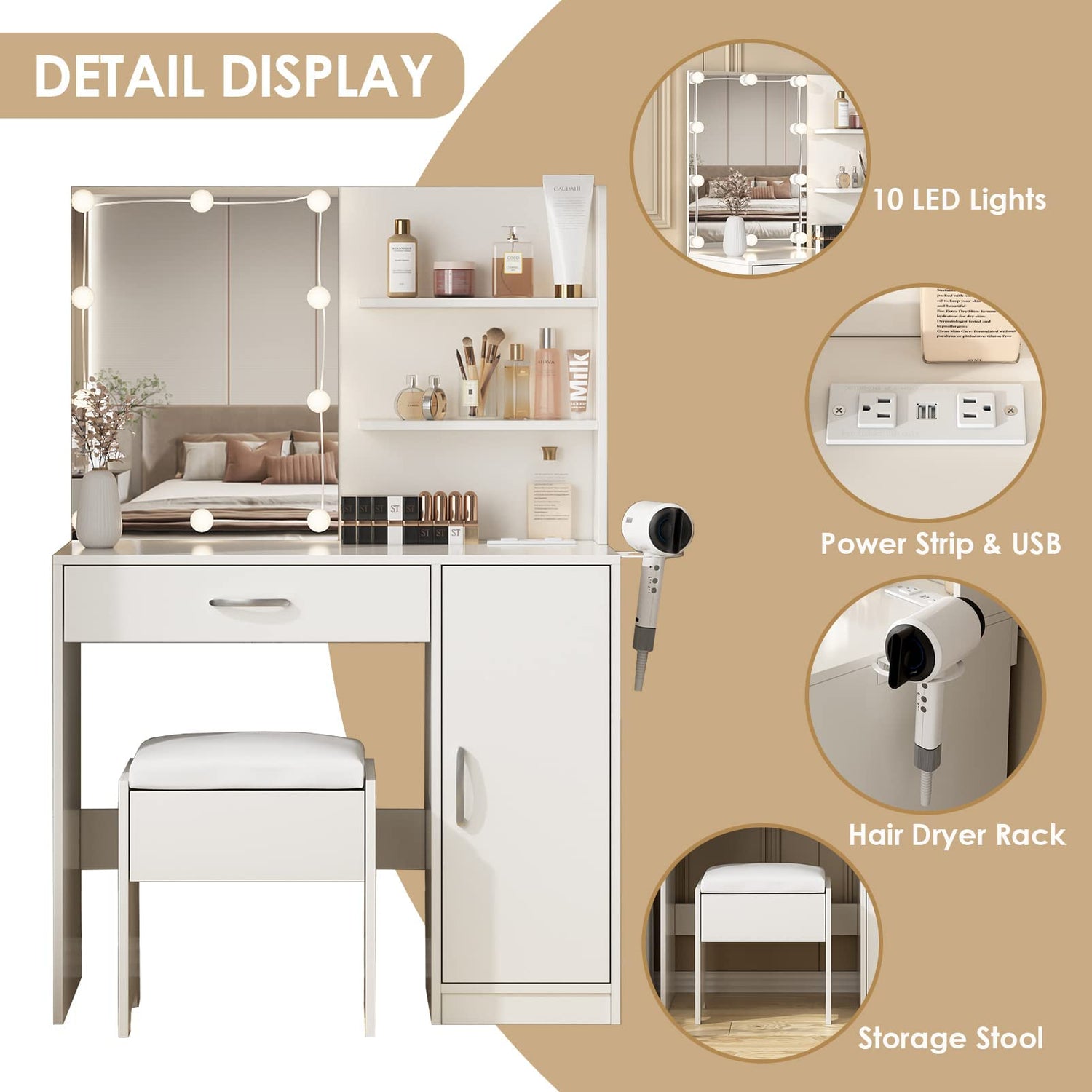 - 【Sufficient Storage Space】The vanity set contains 1 Oversized drawers, 2 shelves and 2-layer cabinet. All your cosmetics and skin care products can be sorted and stored tidily to the vanity table. You can say goodbye to the small and messy table and having a better life with our vanity set.Comfortable cushioned stool belt and hidden storage function.