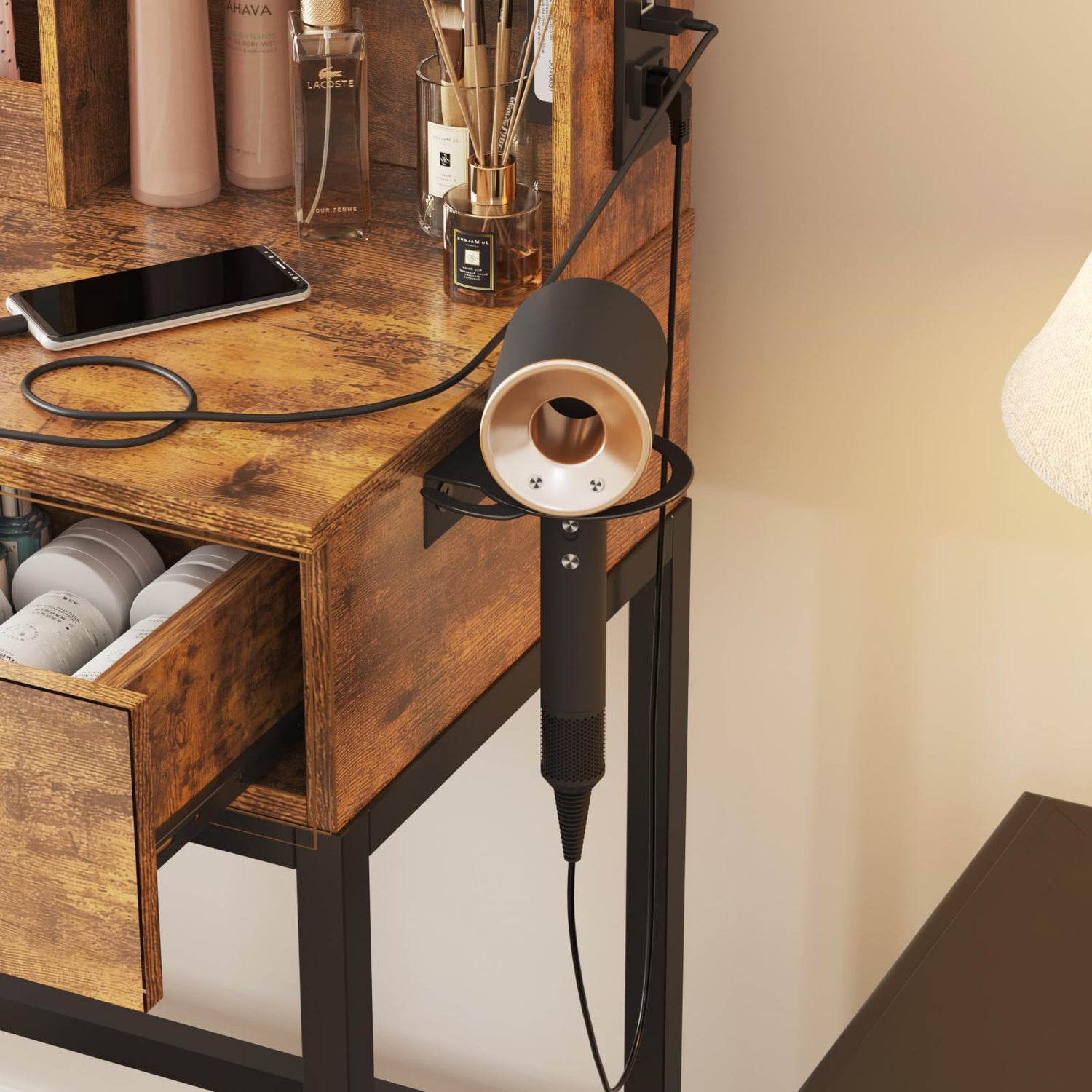 Makeup Vanity Desk with Round Mirror and Lights, Vanity Makeup Table with Hair Dryer Rack, Small Vanity Table for Bedroom with Lots Storage (Brown with Charging, 15.75 * 31.5 * 53.6in)