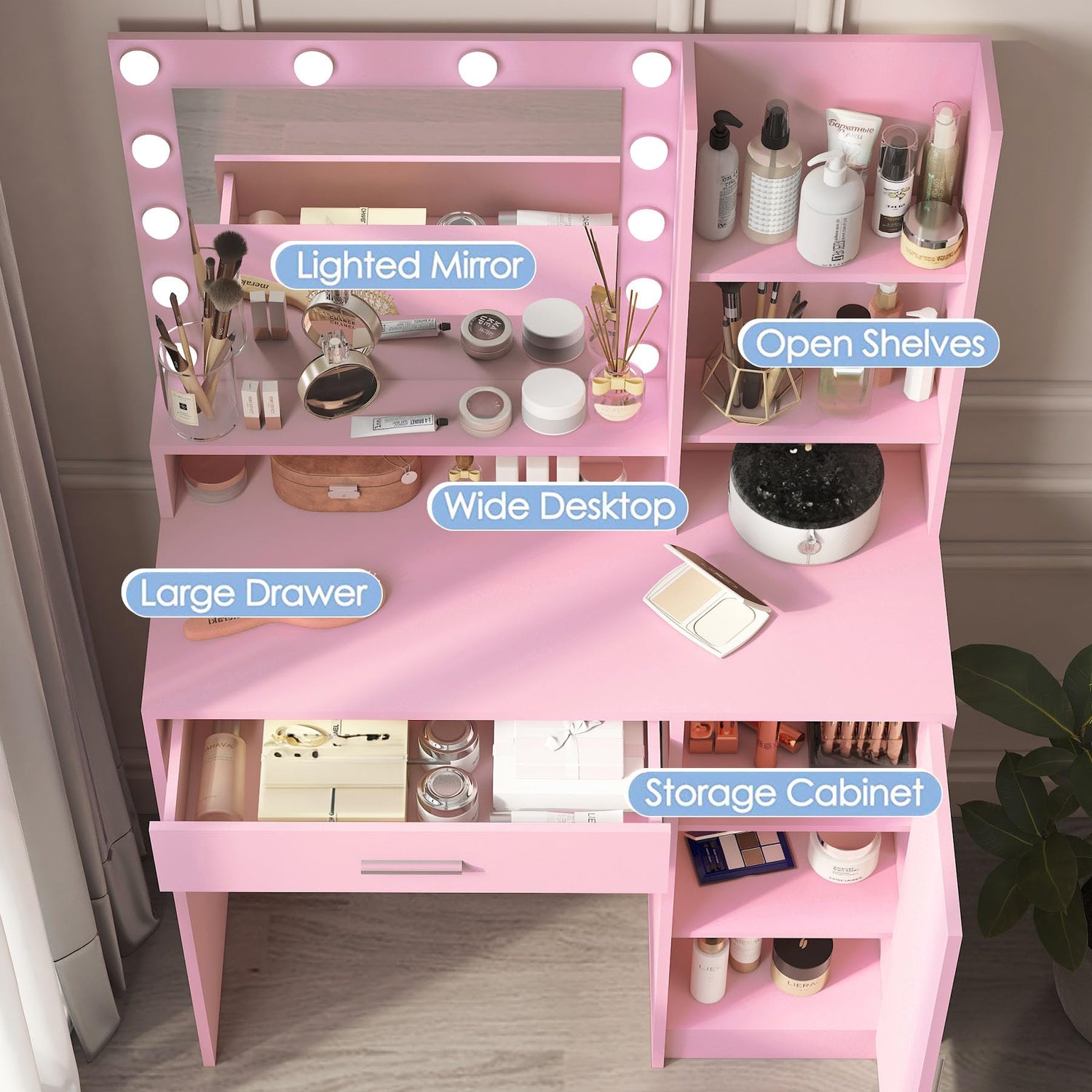 Mdhitsox Vanity Desk with Mirror and Lights, Makeup Vanity Desk, Dressing Table Set with Drawers, Cabinets, Shelves, 3 Lighting Modes Brightness Adjustable, Modern Vanity Set for Gifts Bedroom (Pink)