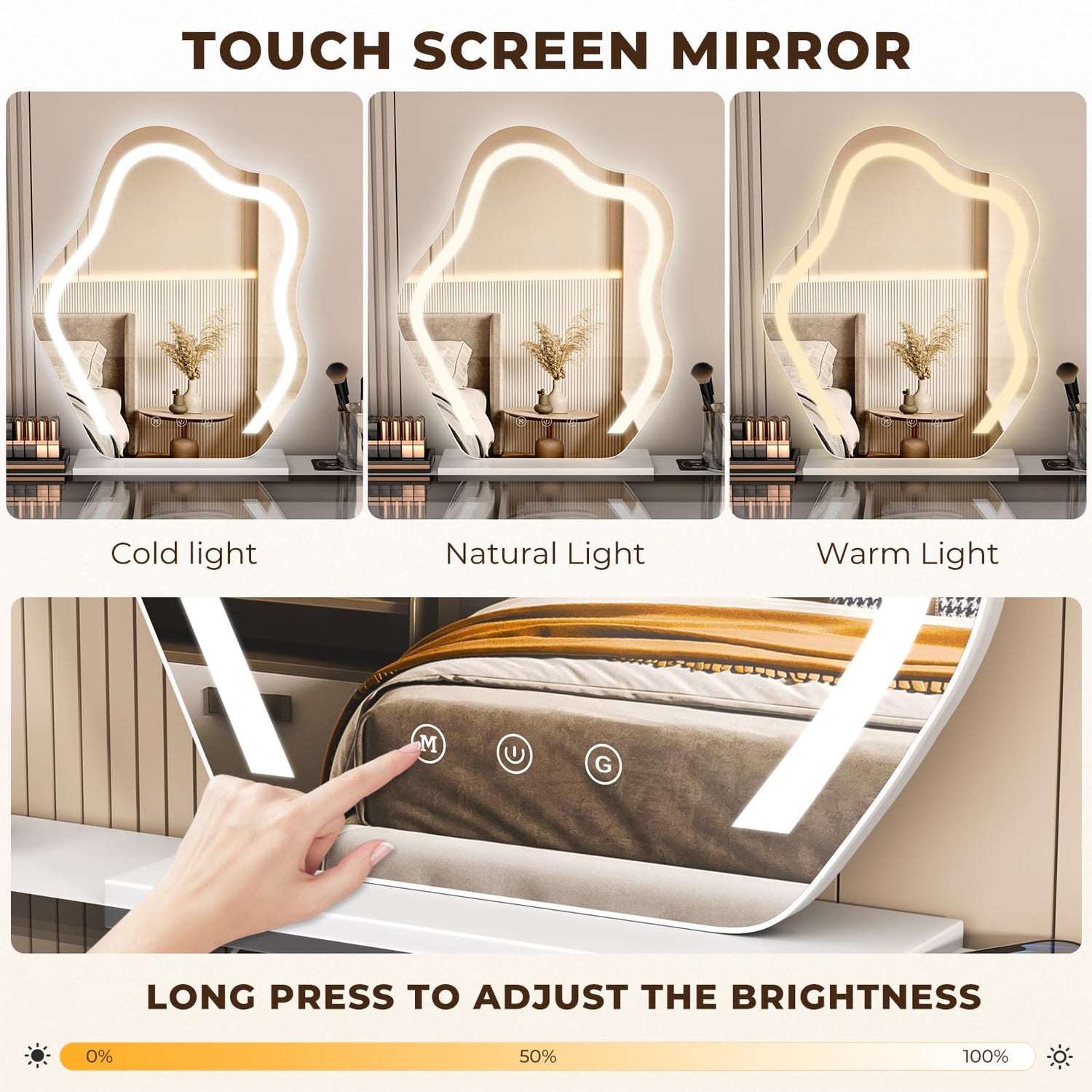 - 【3 Color LED Lights】The vanity desk features a lighted mirror with 3 color lighting modes, including natural, warm and cool light, brightness adjustment of 0-100%, provide perfect light for your makeup at any time and place.
