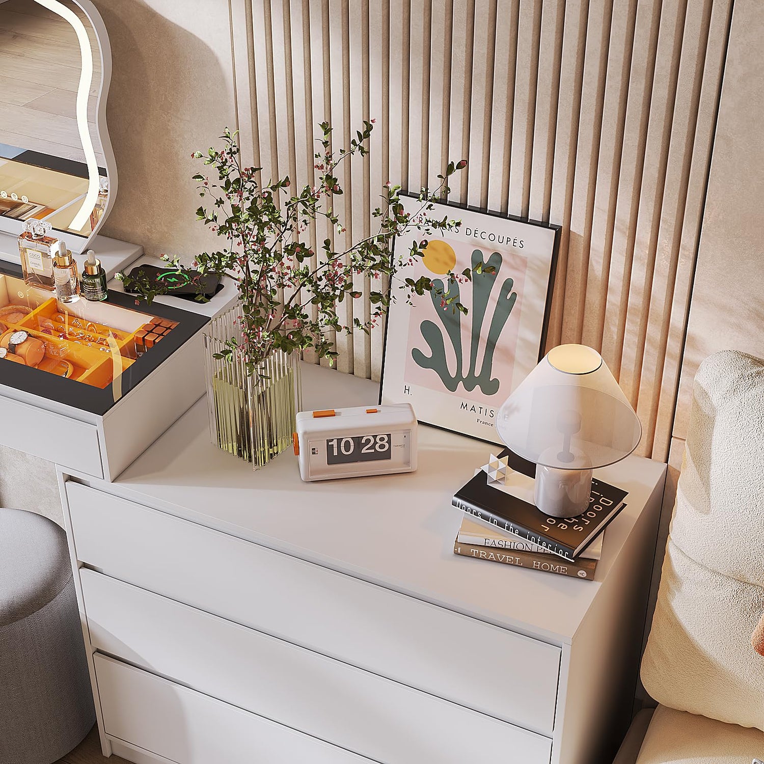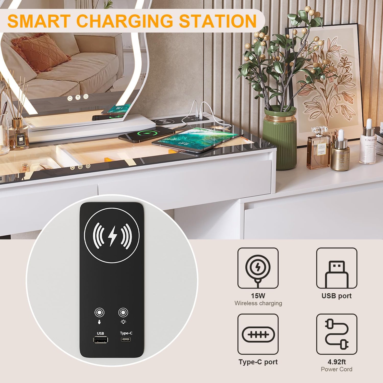 - 【Convenient Wireless Charging】This modern makeup vanity with 15W fast wireless charging, 1x USB, 1x Type-C port, meet the charging needs of different devices such as mobile phones and tablets, making it easier to take selfies or live broadcasts.