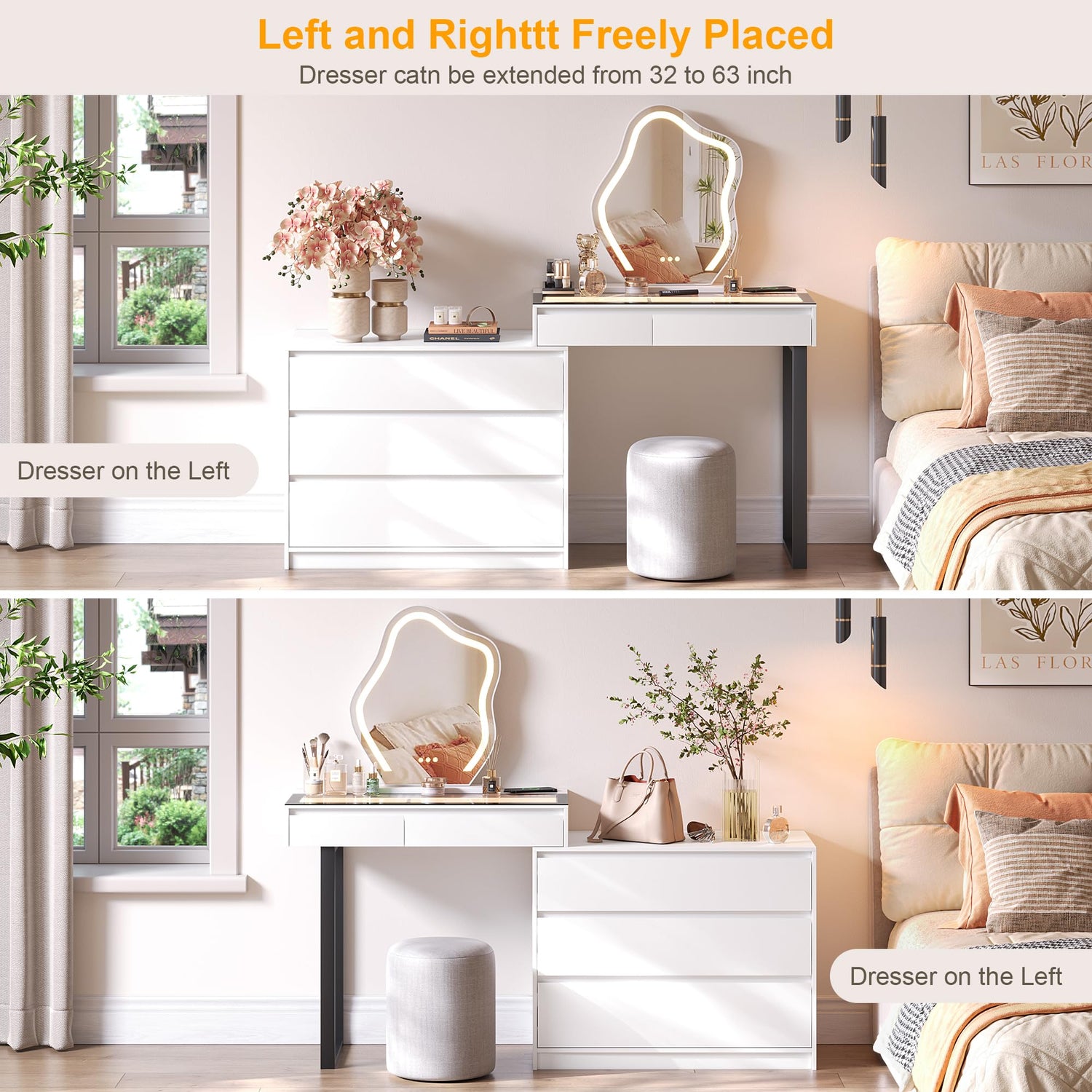 - 【Flexible Vanity Dresser Placement】With the option to install the side cabinet on the left or right to fit for your space and preferences, the length can be extended from 32" to 63". The human sensor lights auto turn on/off when detect human approach about 2-3m, also can be use as a bedside table.