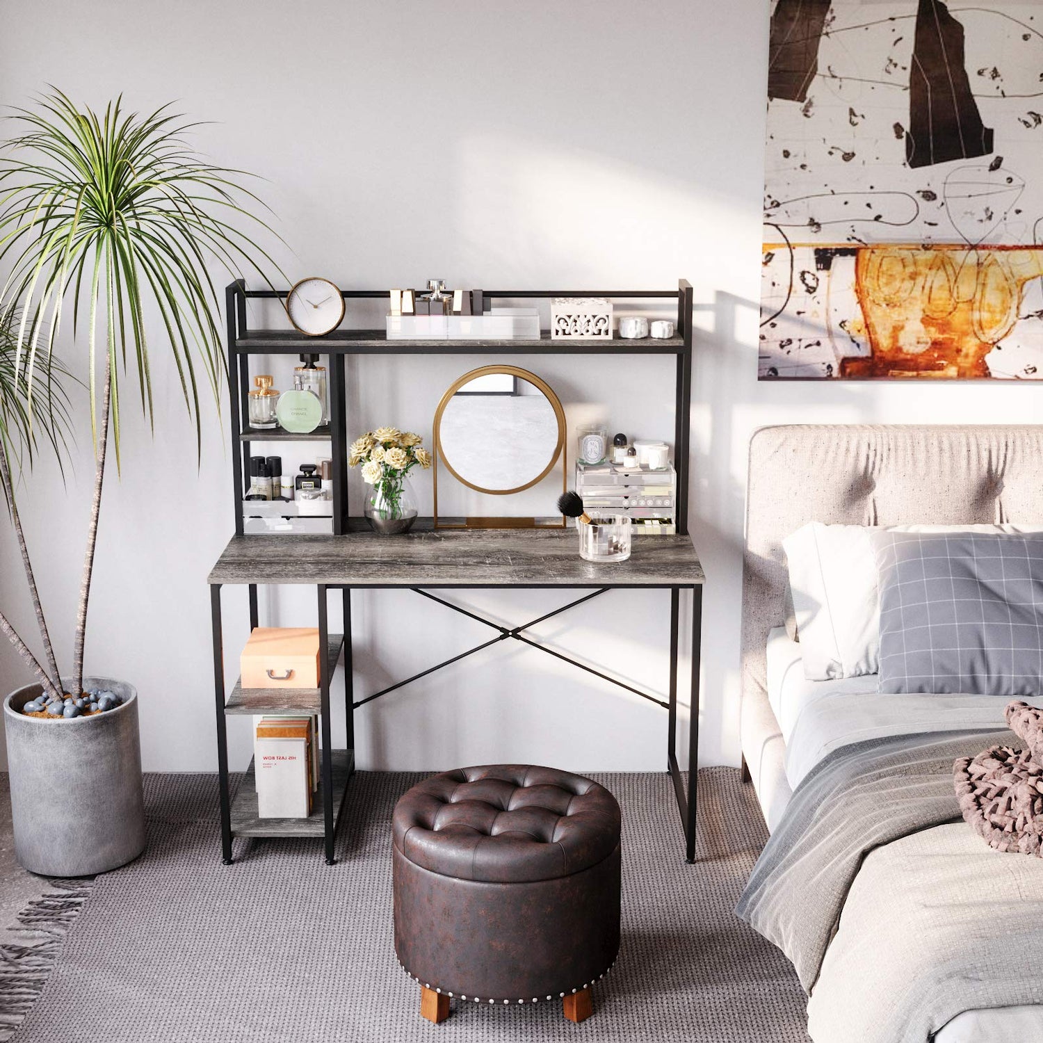 - A stylish grey oak finish that complements your existing furniture and adds a rustic industrial charm to your study, home office, or vanity area.