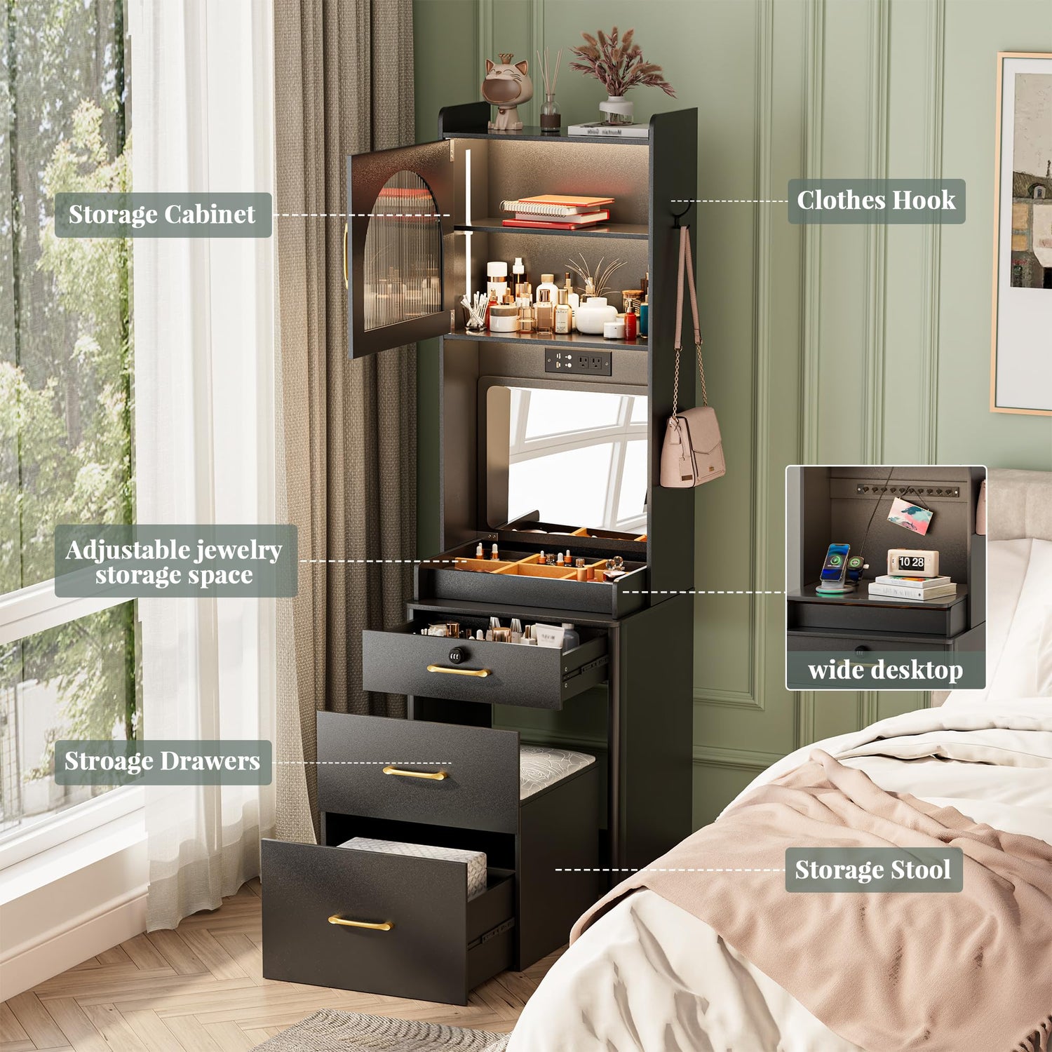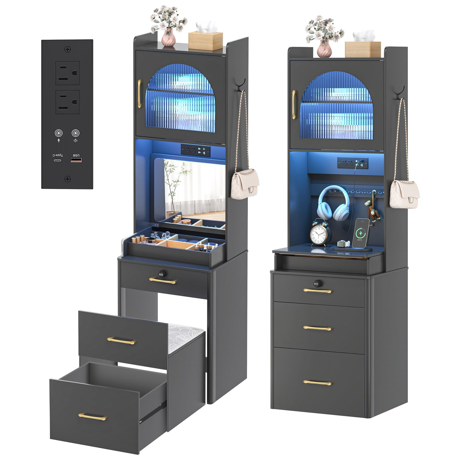 NUNU LAB Small Vanity Desk with Mirror and Lights, 3 in 1 Tall Makeup Vanity Set with Charging Station, Compact Mini Corner Vanity Set Dressing Table for Bedroom Checkroom