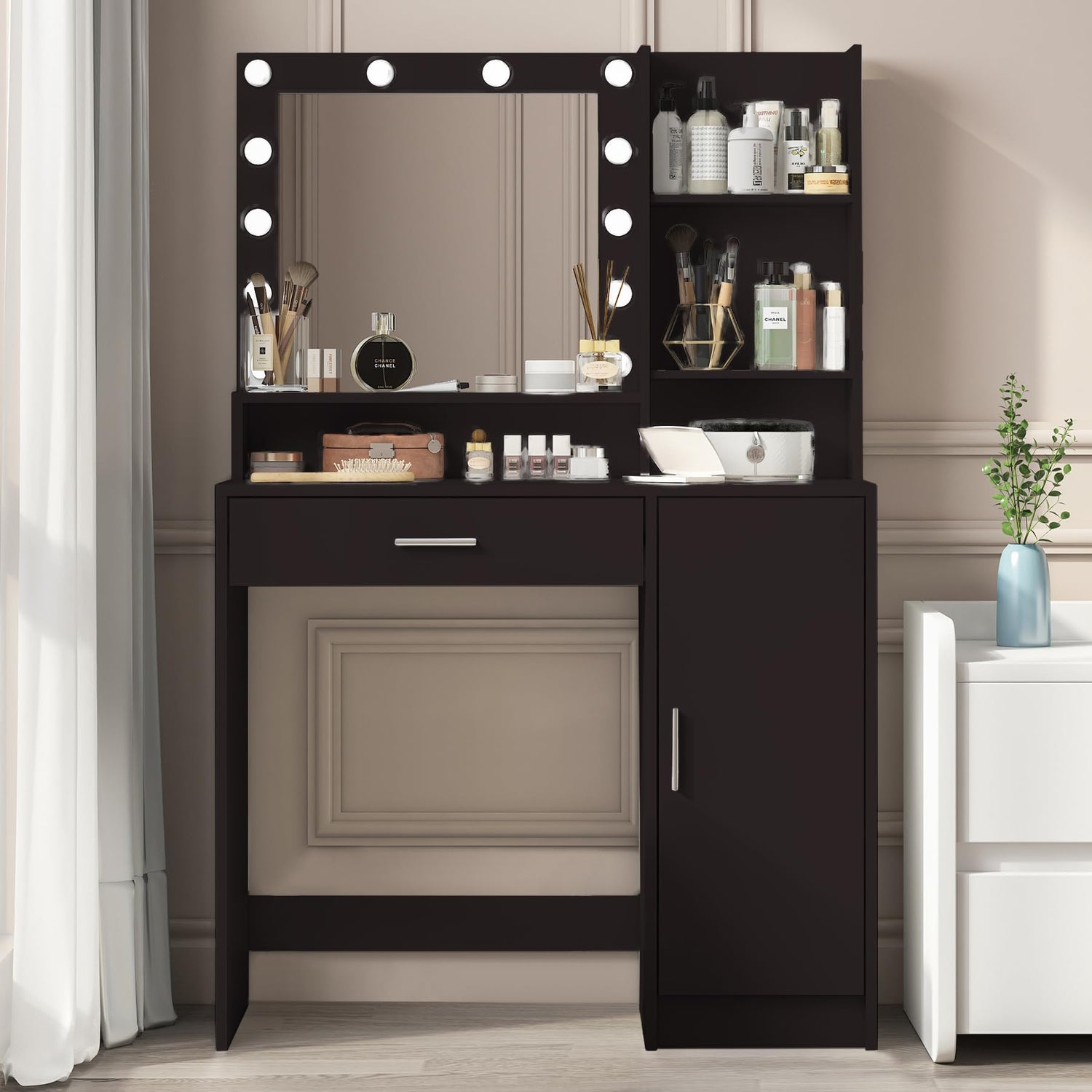 Palimder Vanity Desk with Mirror & Light, Large Drawer & Three Level Storage Dresser, 3 Lighting Modes Adjustable Brightness, Bedroom Dressing Table (Black)