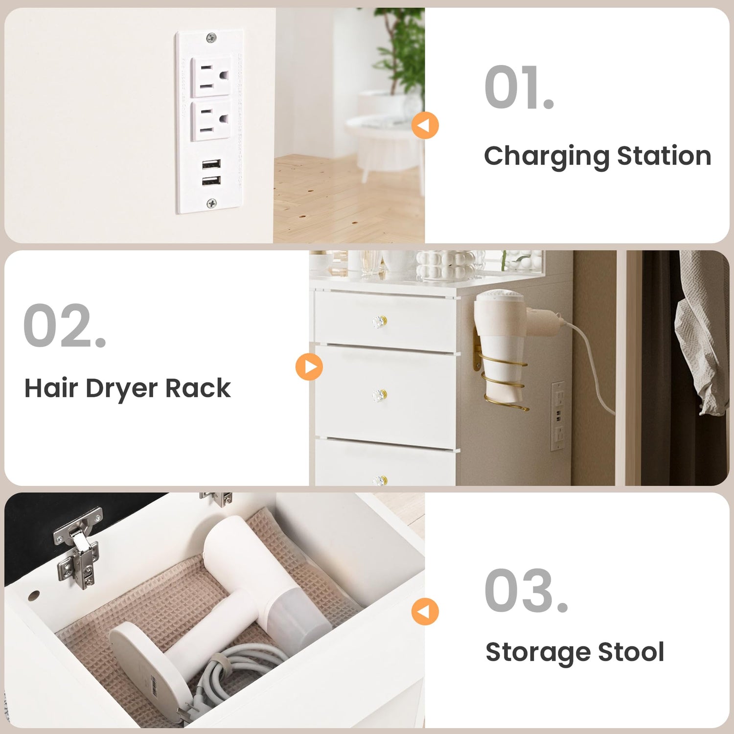 - Extra Functional Design: The included suction mirror provides flexible use. Built-in power outlets support hairdryers, straighteners, or chargers. This vanity table allow you to conveniently connect and charge your hair tools, smartphones, tablets, and other devices, making this vanity practical for everyday use.