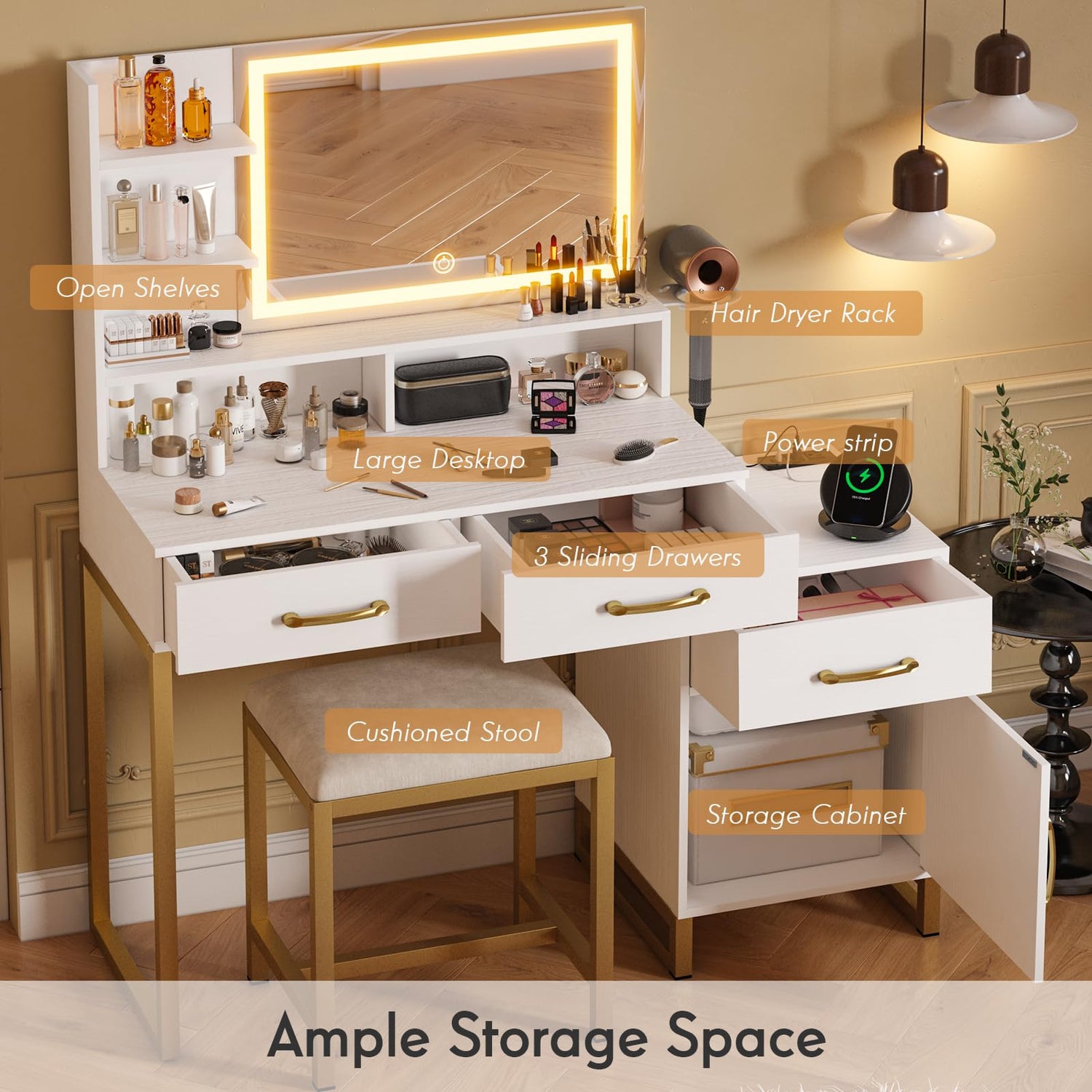 REVOMINCA Vanity Desk with Mirror and Lights, Modern Makeup Vanity with Charging Station, White & Gold Vanity Table with 3 Drawers & Cabinet, 3 Lighting Modes Brightness Adjustable, Bedroom