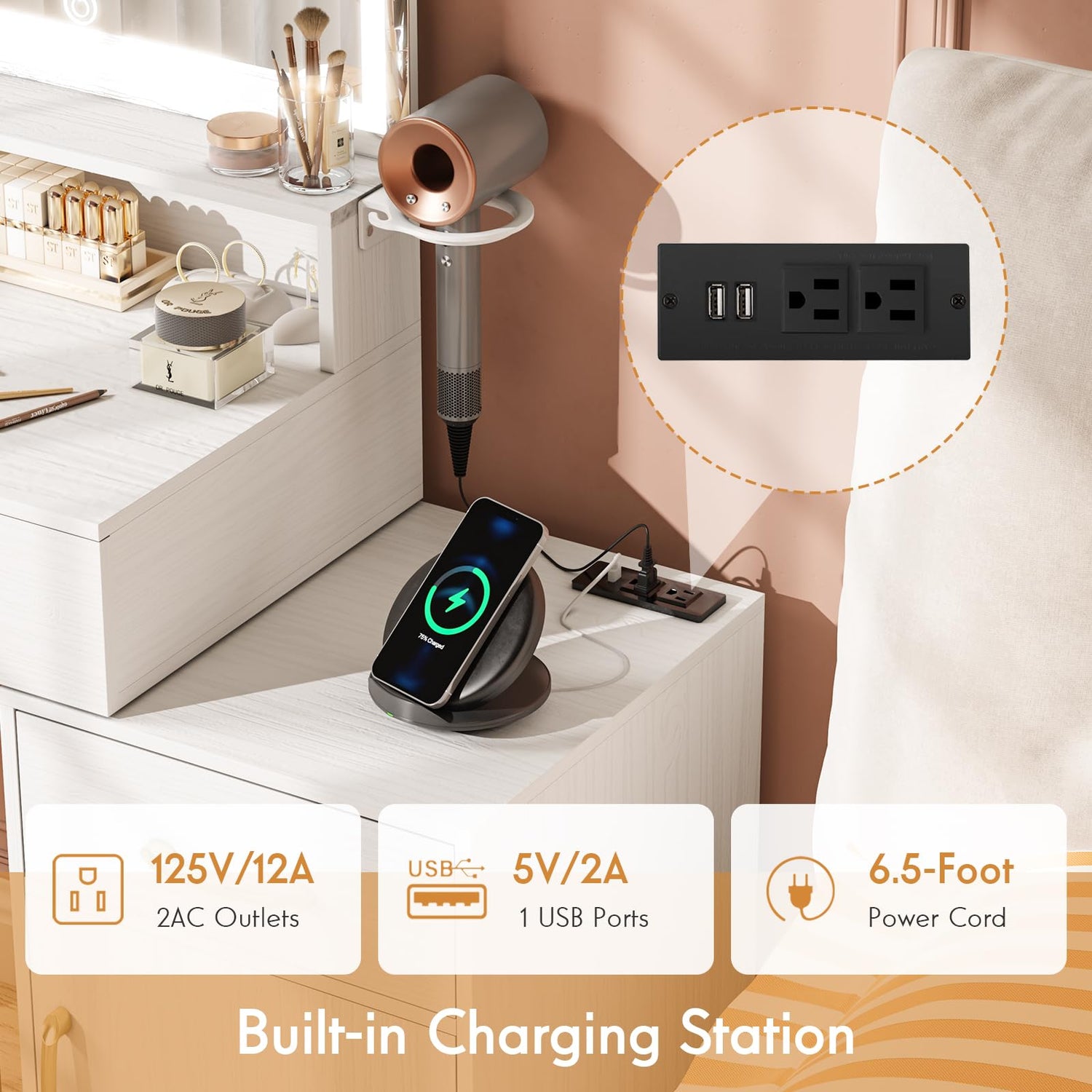- 【Charging Station and Hairdryer Stand】You don't need to worry about the power anymore! This makeup vanity comes with a power outlet, hairdryer holder and a comfortable seat, making it extremely convenient for you to use vanity mirror with lights desk.