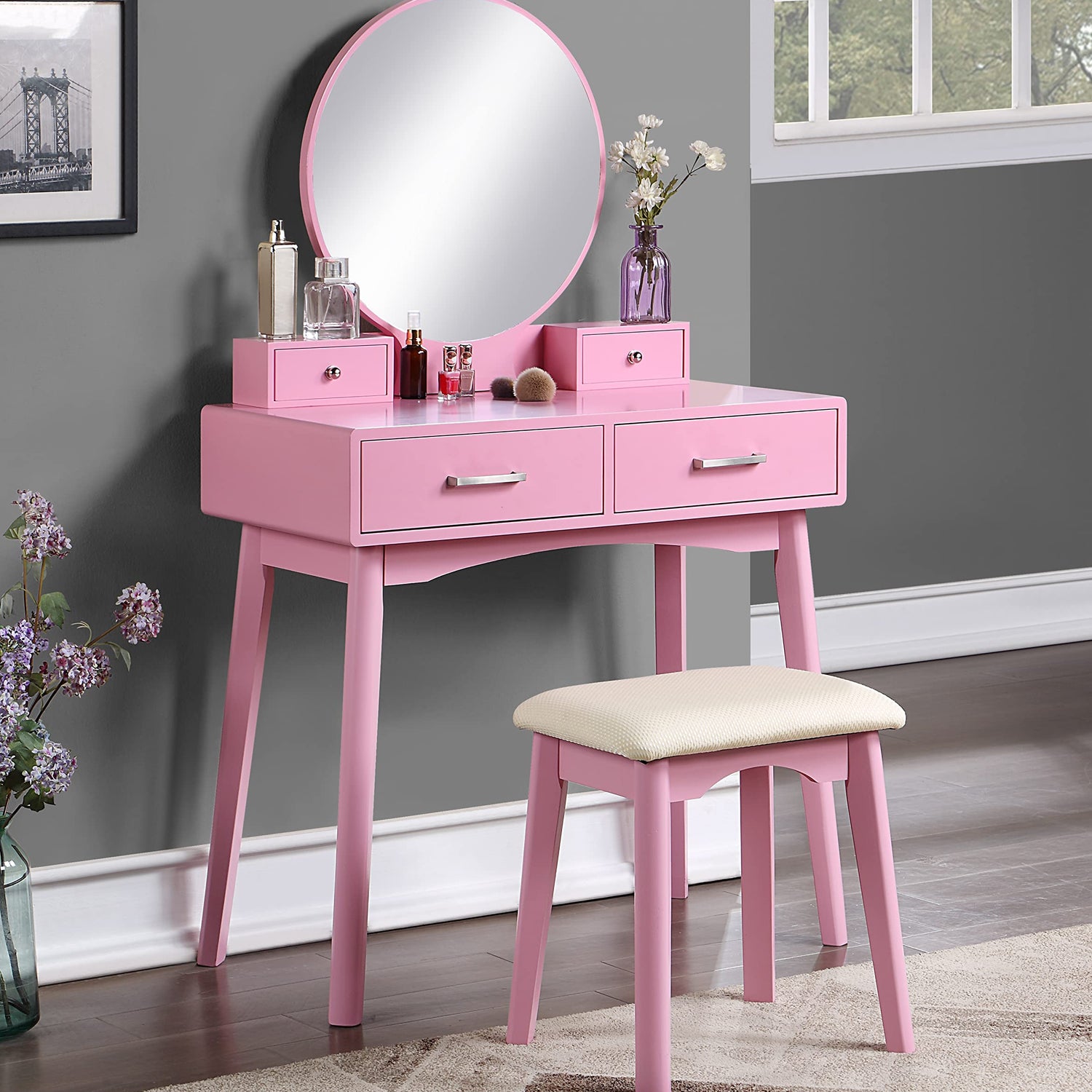 Roundhill Furniture Liannon Contemporary 4-Drawer Wood Vanity and Stool Set, Pink
