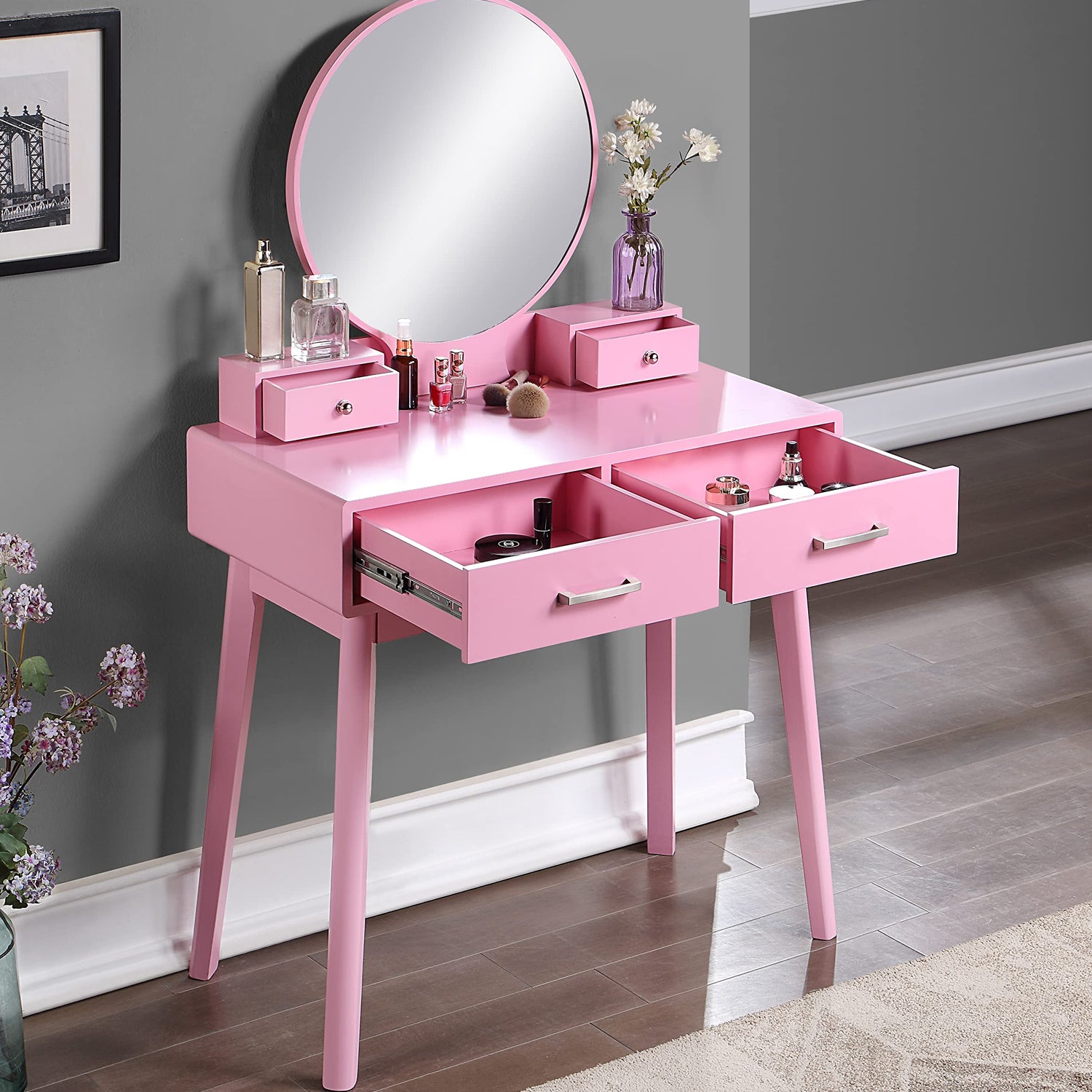 - The vanity features round mirror and tapered legs, four drawers provide ample storage space. The drawers sit on metal glide with metal drawer pull