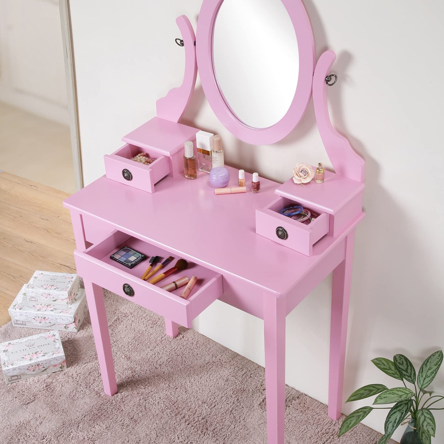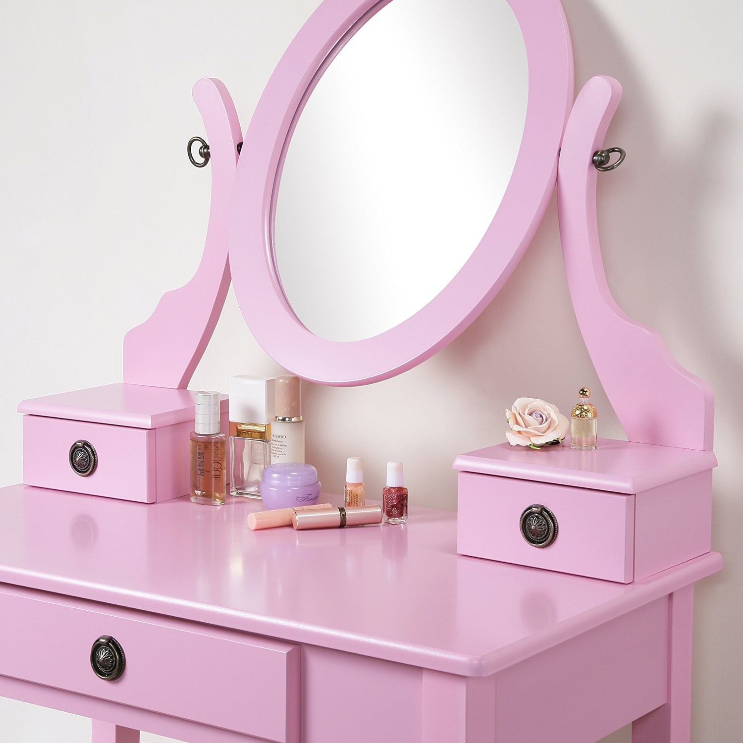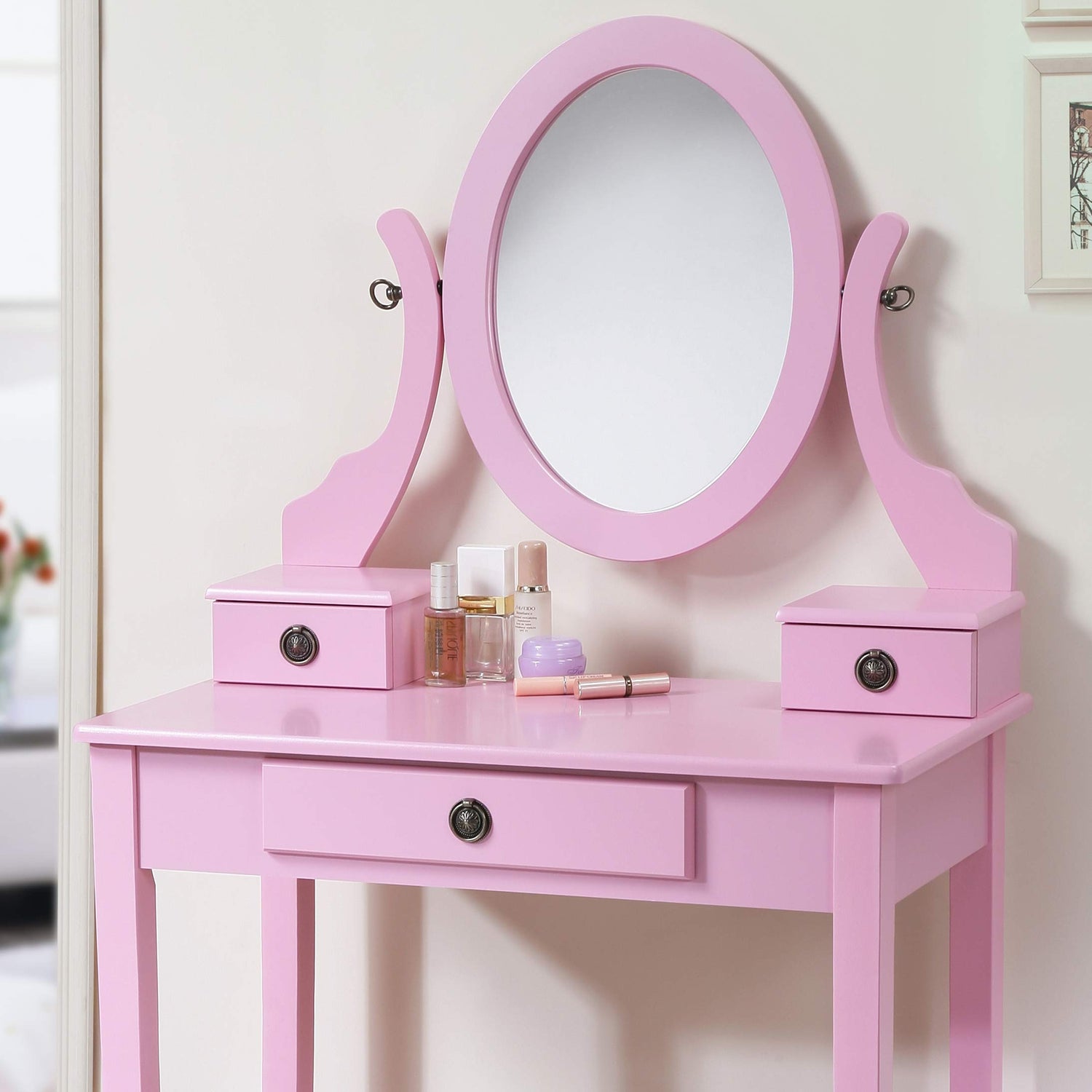 - Set includes Vanity table, mirror and stool, 3 storage drawers