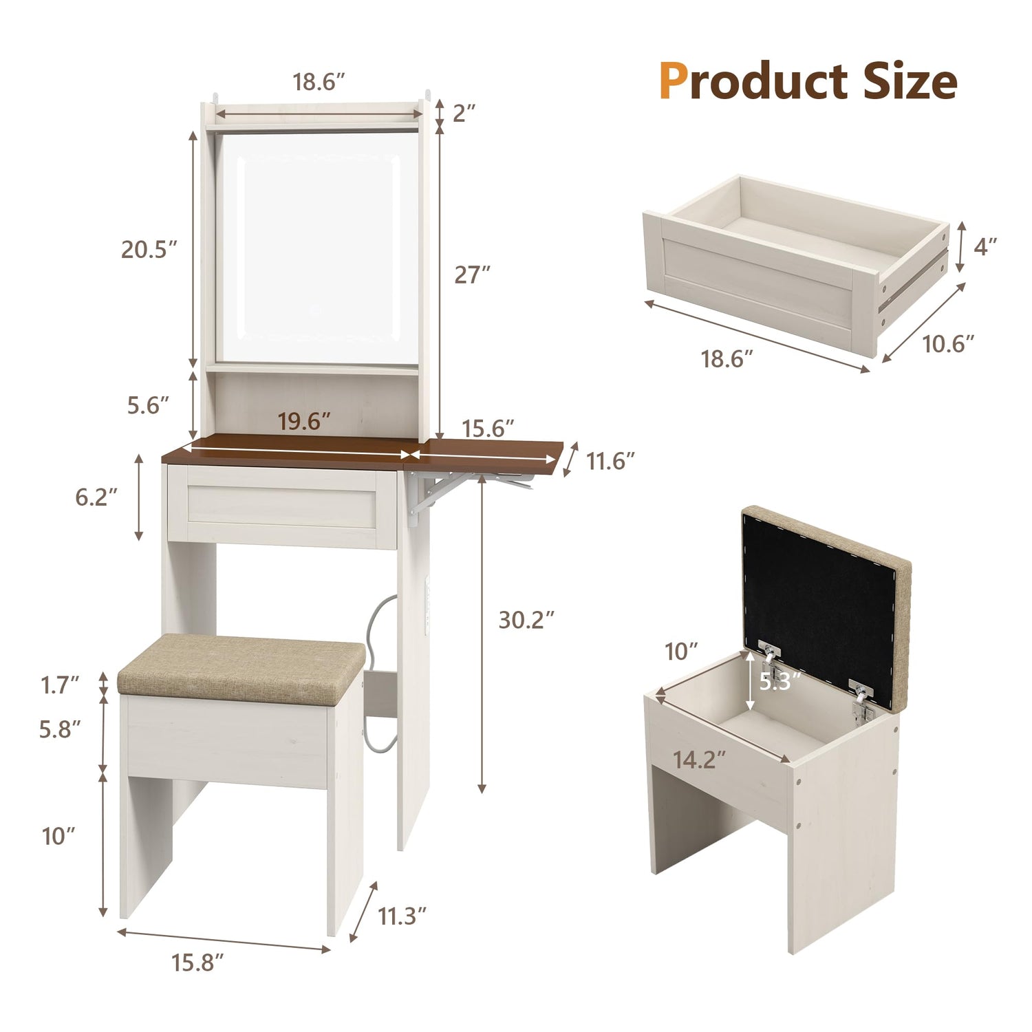 - Easy Assembly & Reassuring:Vanity desk dimensions 19.6 “L(Expanded with fold-up panel to 35.2”) x 11.61”W x 59.45”H, ideal for apartments and small bedrooms. simplifies assembly with clear instructions, labeled parts, and spare hardware. If you encounter any issues, please contact us for dedicated service