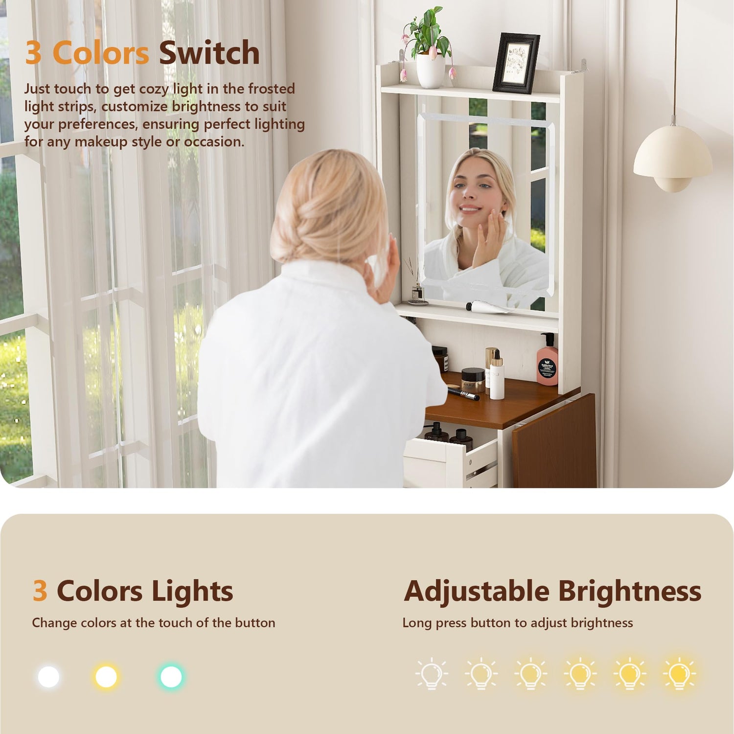 - Vanity with Adjustable Lights: White vanity with lighted mirror offers three lighting options—natural, warm, and cool. Long-press to adjust brightness, allowing you to customize the LED lighting to suit various scenarios and makeup styles, making your lighting experience more personalized
