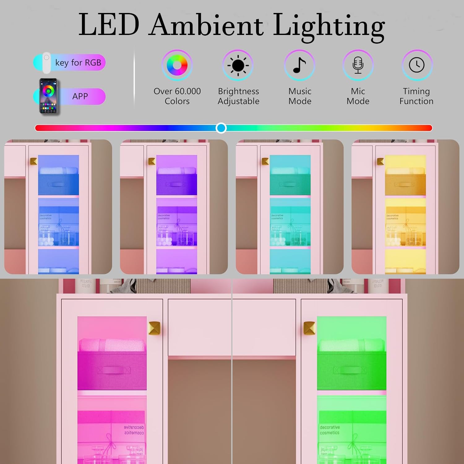 • Glass Display Cabinet with Customizable RGB Lighting: This makeup vanity features a glass-door display cabinet with 60,000+ colors, multiple dynamic light modes, music mode, microphone mode, and a timing function. Sync with your music or set the perfect ambiance to enhance your space and elevate your beauty routine