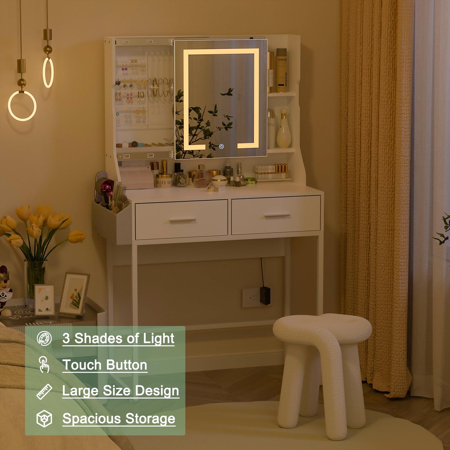 Uiithokyia White Vanity Desk, Makeup Vanity Table with Mirror LED Lights, Vanitys for Jewelry Organizer, 2 Storage Drawers, and Side Pockets Hair Tools Storage, Bedroom Vanity Table for Women, Girls