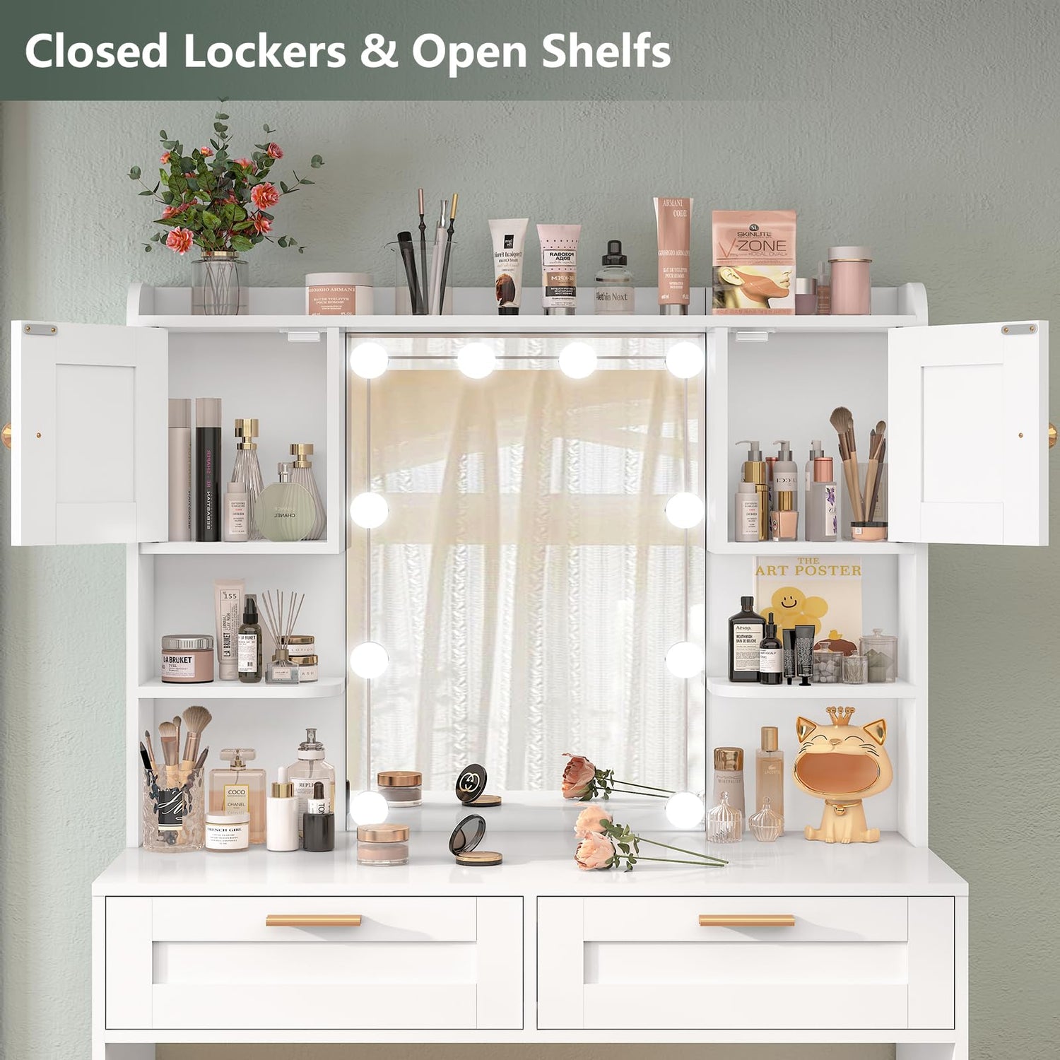 usikey Vanity Desk with Mirror and Lights, Makeup Vanity Table with 2 Drawers, 2 Cabinets & 2 Shelves, Vanity Desk, Vanity Table for Girls Women, Bedroom, White