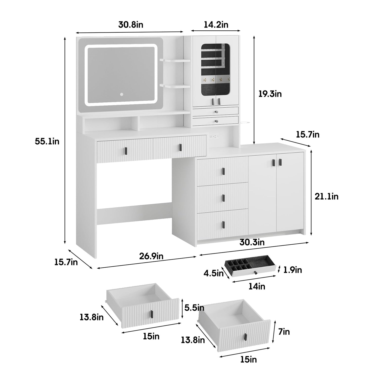 - Big Vanity With Abundant Storage Space:This Large 57-inch vanity offers abundant and practical storage space.First of all the spaciou tabletop and the shelves on the side of the mirror can store your daily use cosmetics.Then this dresser has a special cabinet for storing your jewelry, which has hooks and ring storage built-in sponges to keep your jewelry organized.In addition to this, there are 5 drawers, 2 jewelry drawers, 2 cabinets with adjustable wood panels to meet all your storage needs