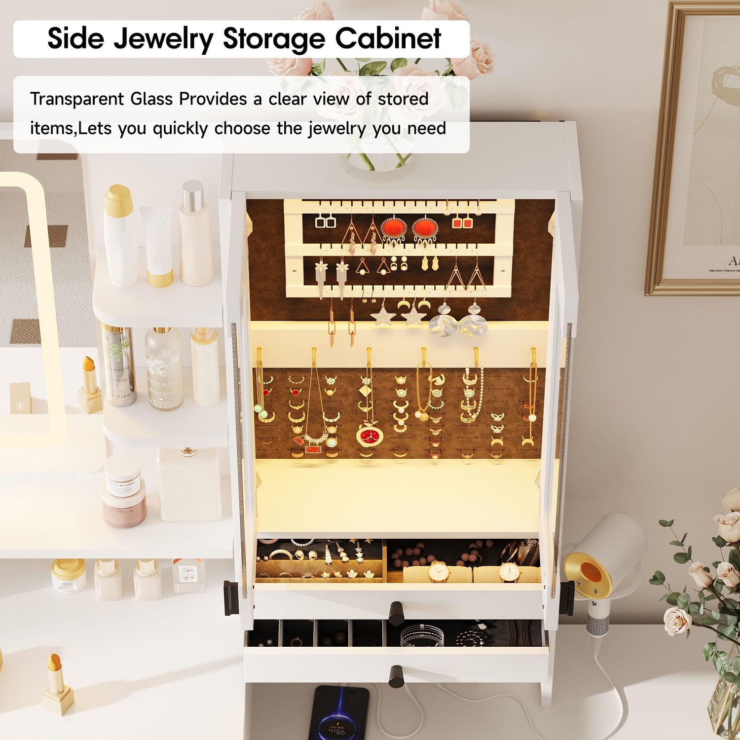 - Vantiy Deske With Power Strip&Led Lights:This new style vanity provide 2 standard plug sockets and 2 USB ports,et you easily charge hair dryer, curling iron, phone or other mobile devices during makeup time.Also There are LED light strips in the glass cabinets and at the bottom of the cabinet,Not only does it add to the ambiance of your room at night, but it's also a quick way to find the right jewelry.