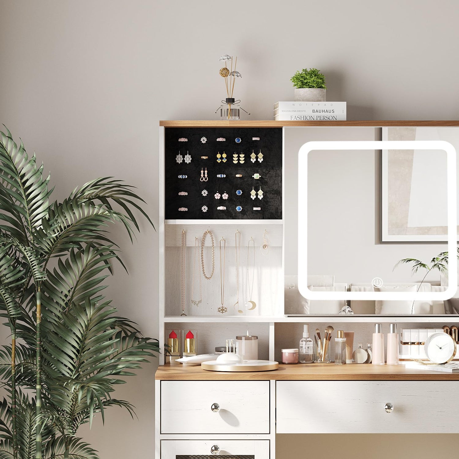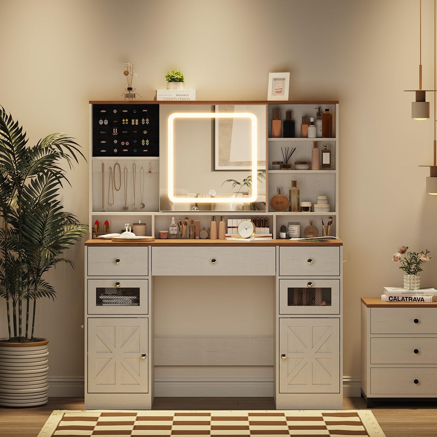 Vabches Farmhouse Makeup Vanity Desk with Mirror and Lights,White Vanity Table with Charging Station & Jewelry Storage,5 Drawers & 2 Cabinets,Dressing Table with Hidden Storage & Open Shelves