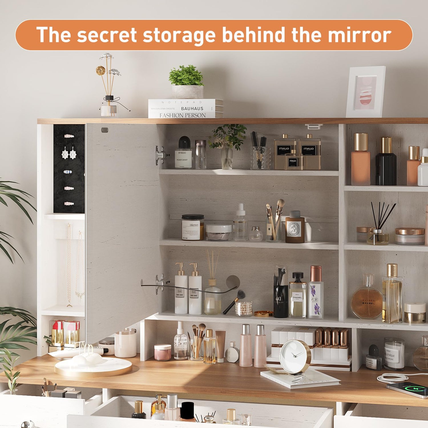 - Vanity Desk With Plenty storage space:This makeup table featuring 5 smooth-gliding drawers and 2 spacious cabinets,There are also open storage shelves,jewelry hooks.The most unexpected thing is that there is a hidden storage space behind the mirror.This dresser can holds tons of storage for a lady's things.
