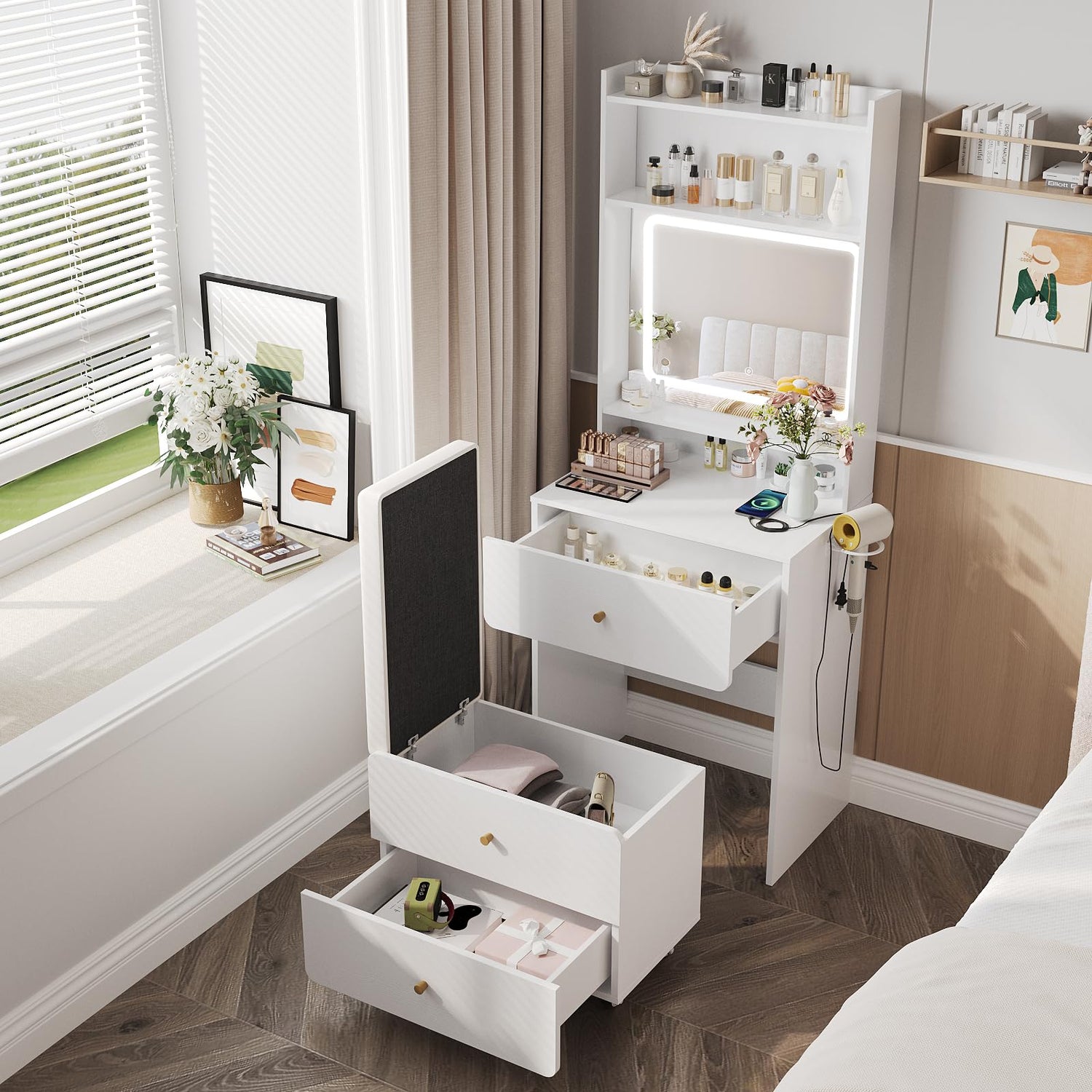 Vabches Make Up Vanity Desk with Mirror and Lights, White Vanity Table Set with Charger Station,Girls Small Vanity and Storage Chair