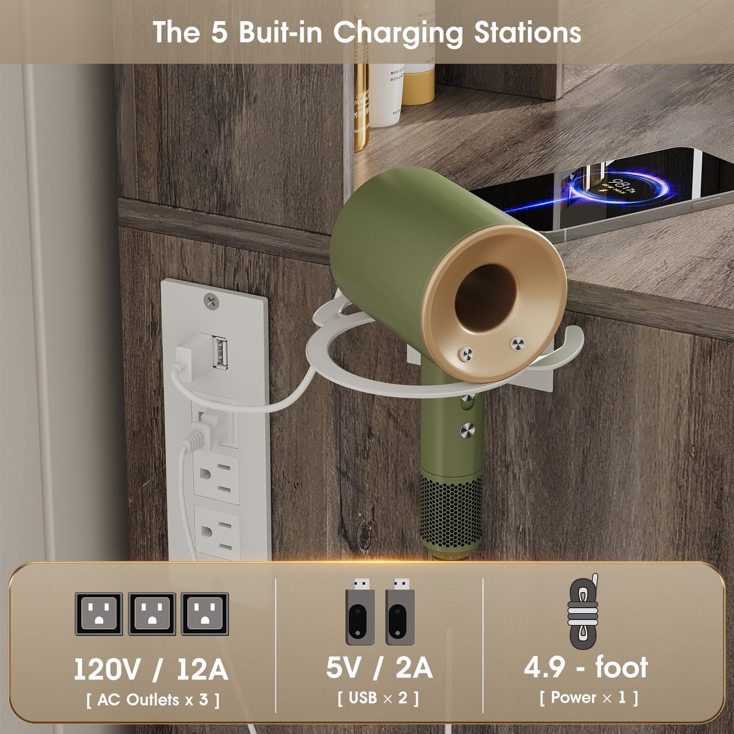 - CONVENIENT CHARGING DESIGN: The make up vanity with 5 built-in charging stations (3 outlets and 2 USB ports) will solve your problem of not having a port to plug in your hair dryer, and you can charge your phone while applying makeup at the same time. The desk also has a special hook to put the hair dryer conveniently.