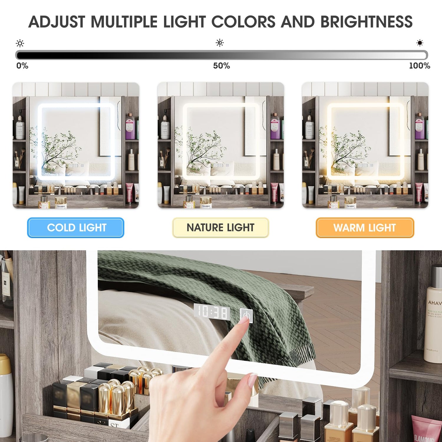 - SMART DISPLAY FUNCTION: This grey vanity with lighted mirror features a built-in time and temperature display. The time helps you to immerse yourself in makeup without having to look at your electronic devices frequently. And the temperature helps you to make a quick decision for today's outfit.