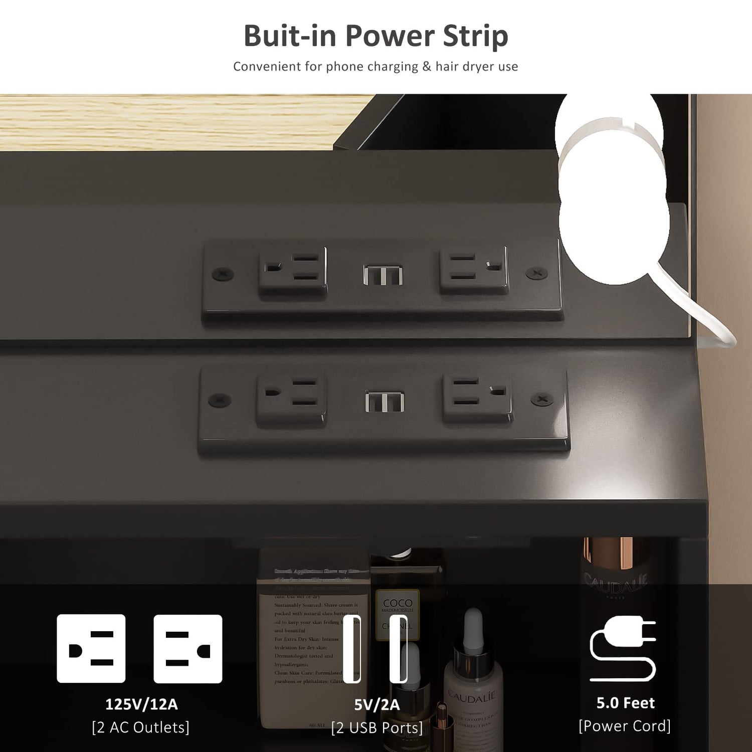 - đăBuilt-in Charging StationăNew Design functional makeup table, with 2 standard plug sockets and 2 USB ports on storage shelf, save space and convenient for hair dryer, mobile phone, curling iron, etc. On the side of this cute vanity, we also add a metal rack for hair dryer or cup, you can install it on either side, no need to tuck your hair dryer into a drawer anymore, easy access and use.