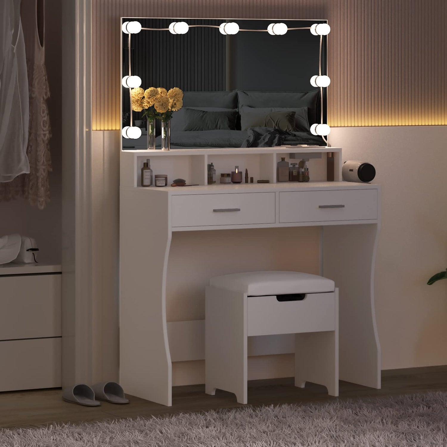 - đăAmple Storage SpaceăLarge desk top with storage shelf and 2 drawers, this vanity table provide plenty space for all your cosmetics, and keep everything organized: makeups, hair straightener, blow dryer, jewelry, lotions. Extra space in the soft cushioned stool for private items, make your bedroom more tidy and clean.