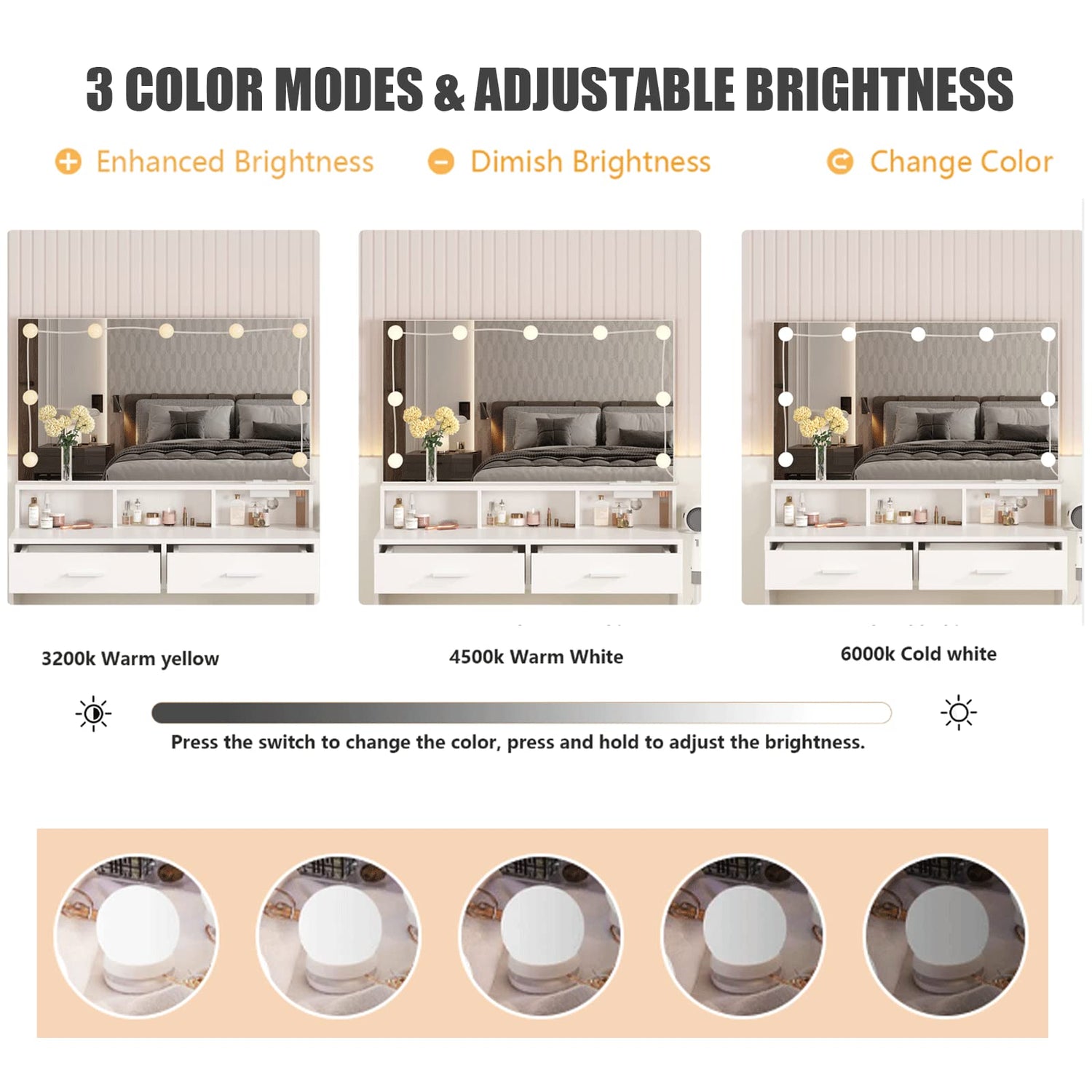 - đăPerfect Size & Large Mirroră Vanity desk: 31.5"(W)*15.75"(D)*55.16"(H), with soft and comfortable vanity bench: 14.57"(L)*9.45"(W)*16.8"(H). Extra large mirror with bright and gorgeous Hollywood plastic bulbs, provide 3 color modes (warm/natural/cool) and adjustable brightness, this make up vanity can meet all your different needs, perfect vanity for bedroom.