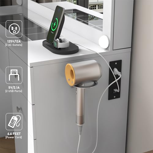 - 【Vanity Desk with Charging Station】The vanity table is equipped with a built-in charging station, which includes 2 standard plug sockets and 2 USB ports, In addition, our vanity desk provides you with a hair dryer rack to keep your hair dryer and hair curler within arm' s reach.