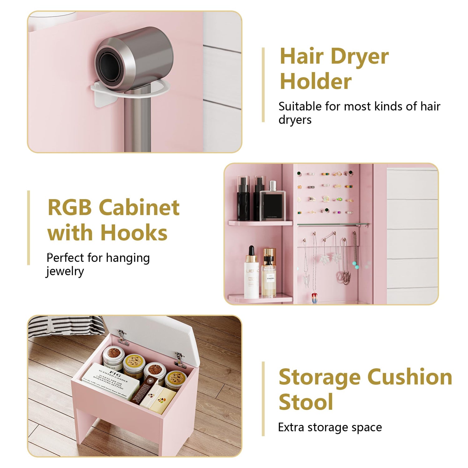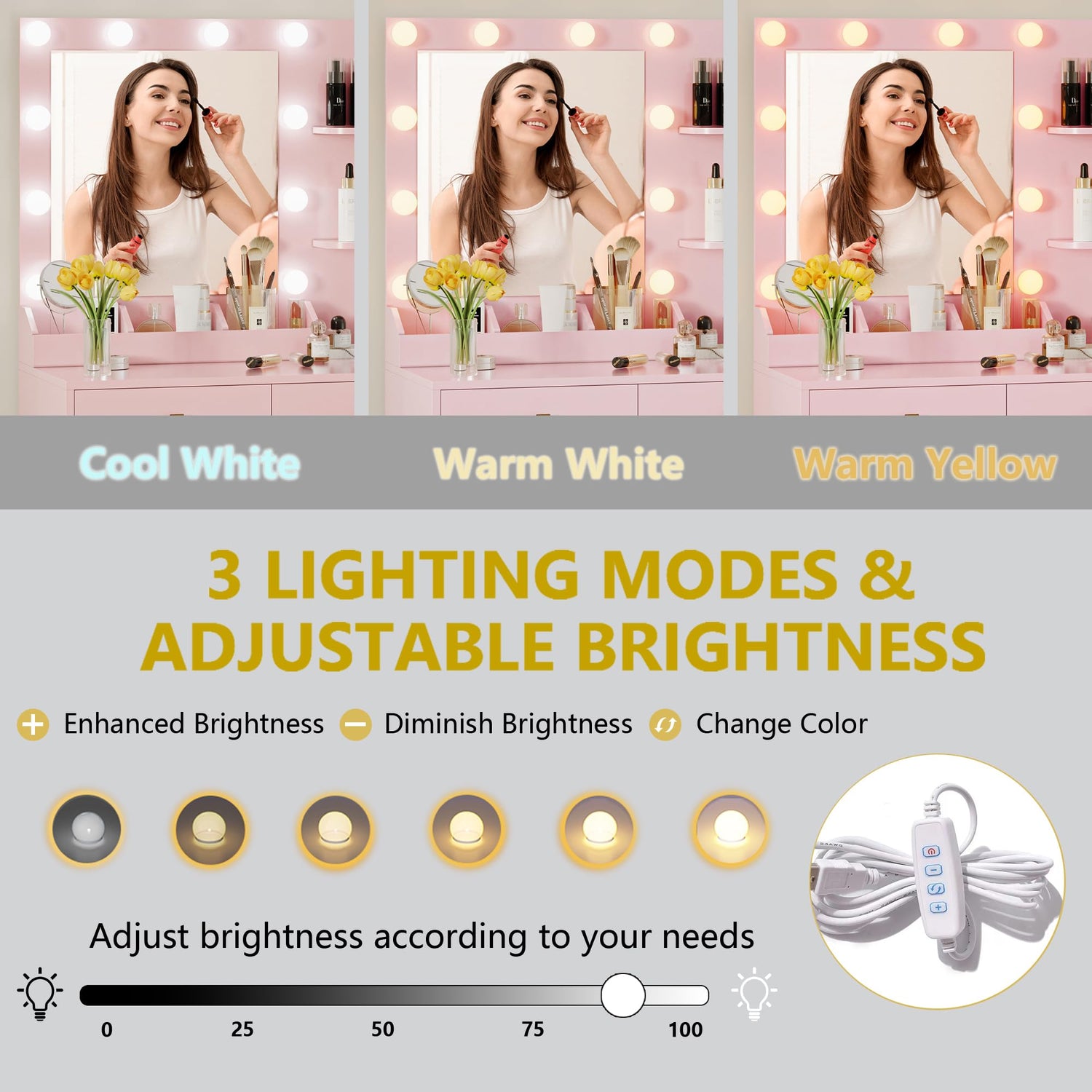 - 【3 Lighting Modes & Brightness Adjustable】The pink vanity is equipped with a big mirror. Surrounding the mirror, there are 10 Hollywood bulbs, providing 3 different light modes: warm yellow, natural light and bright white, the brightness is adjustable which can match your different makeup needs, perfect for home makeup, salon, and live broadcast. So you can experience the star-like makeup treatment