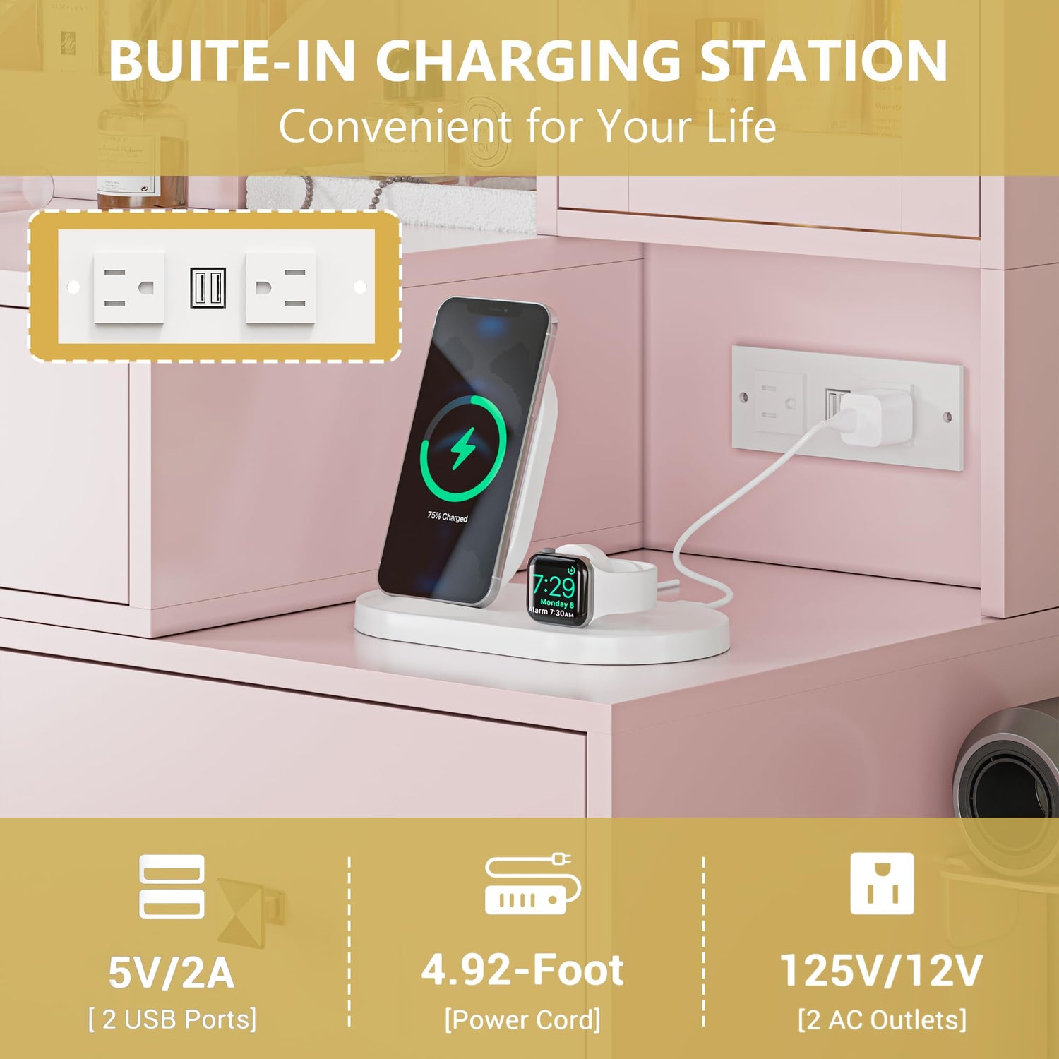 - 【Convenient Charging Station & Hair Dryer Rack】The small vanity desk is equipped with a built-in charging station, including 2 AC outlets and 2 USB ports, through which you can charge and use electronic devices at the same time. In addition, our makeup vanity desk provides you with a hair dryer rack to keep your hair dryer and hair curler within arm’s reach