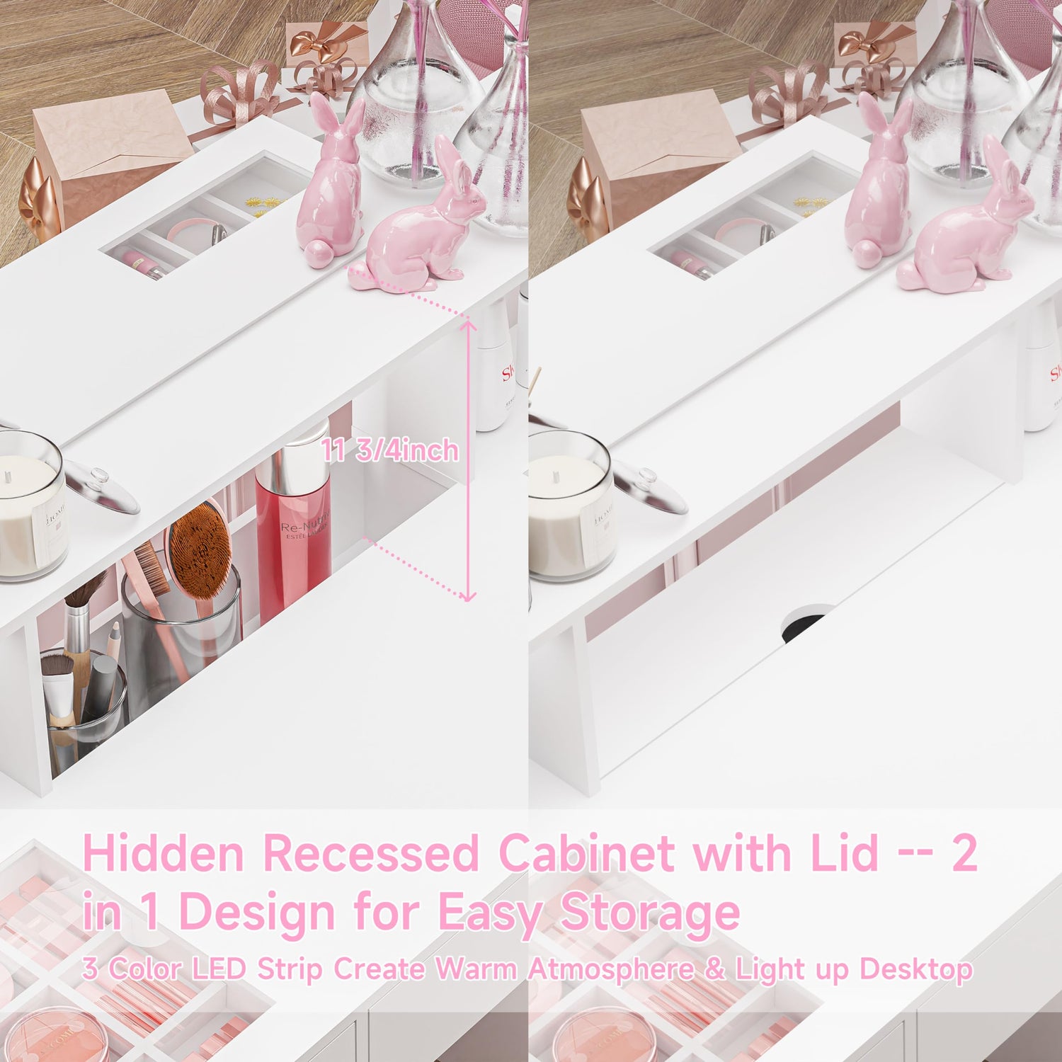 - 【6 Large Drawers & Cabinet】 This extra large mirror makeup vanity table has 2 large drawers with clearly display glass top + 1 slim storage drawers. Plus with 3 side drawers and 1 BIG cabinet for bags and big cosmetics. And spacious desktop to store all your beauty essentials.
