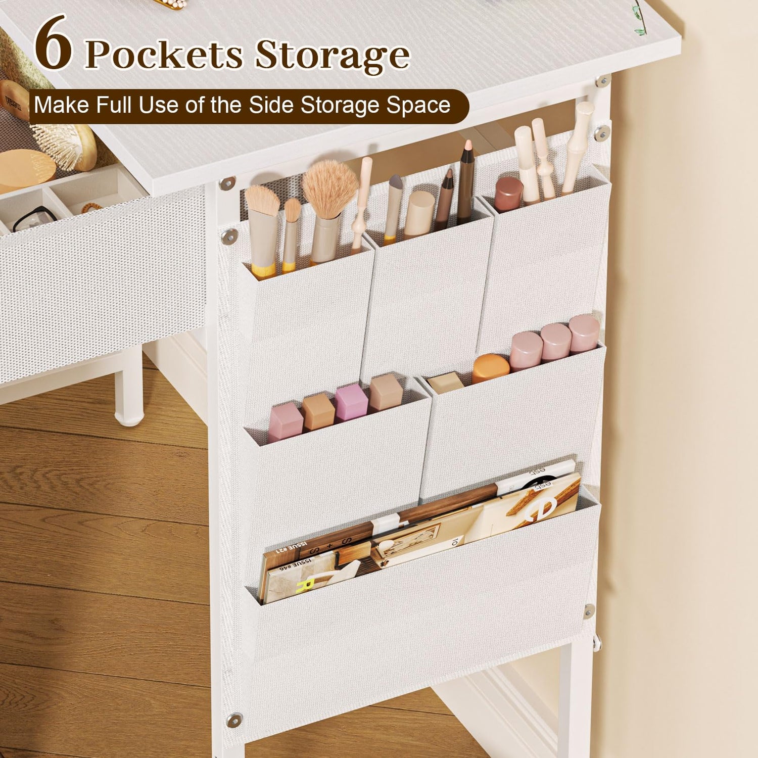 - 【Side Storage Pockets】small makeup vanity equipped with extra side pockets store hot tools (curling irons, blow dryers) or charging cables, a feature missing in other products,keep neat and organized for your room.
