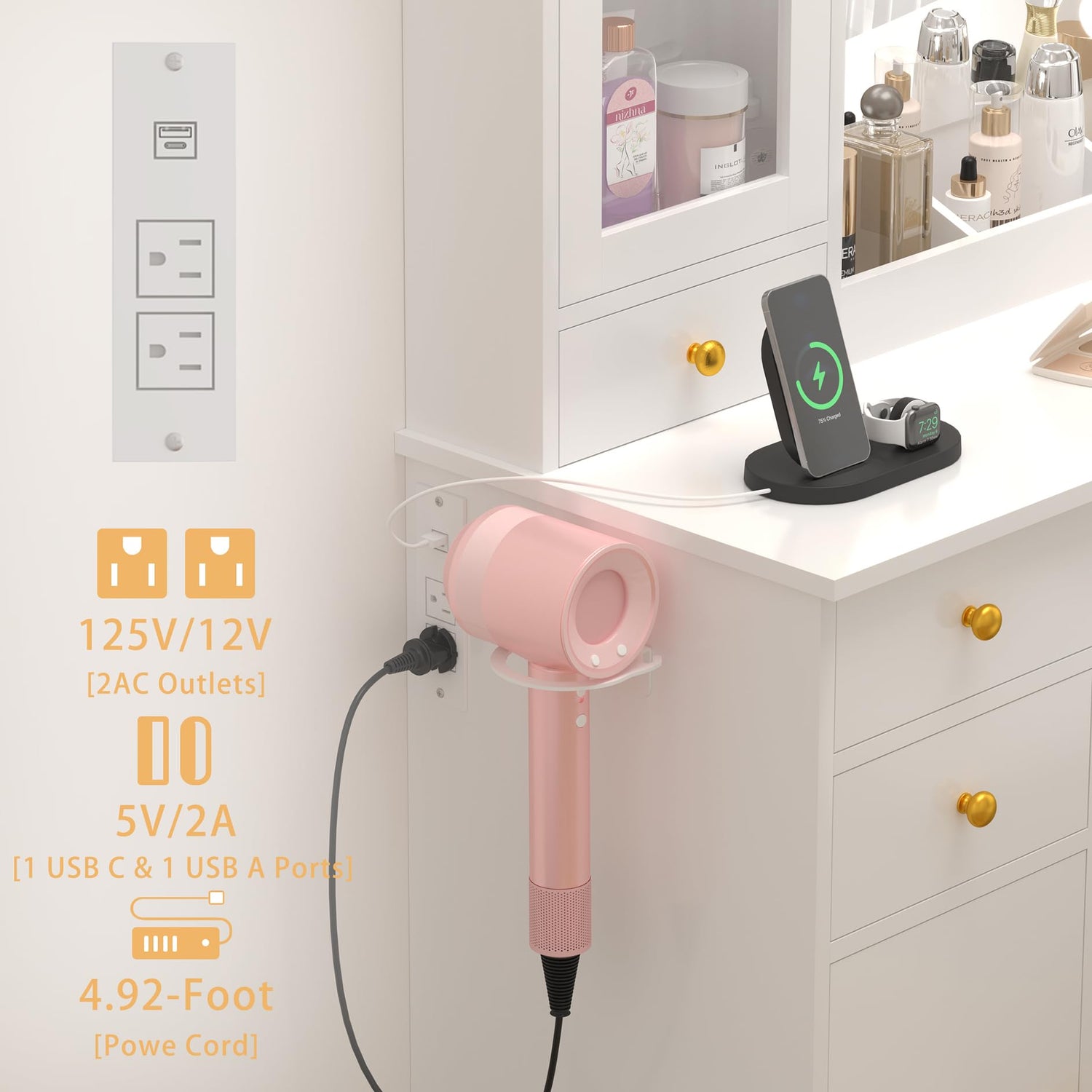 • 【Convenient Built-in Power Outlet & Hair Dryer Rack】Equipped with 2 standard AC outlets, 2 USB charging ports, and a dedicated hair dryer rack, this vanity desk makes your beauty routine effortless. Charge your curling iron, phone, and other devices directly at your vanity without hassle. Designed with women’s daily needs in mind.
