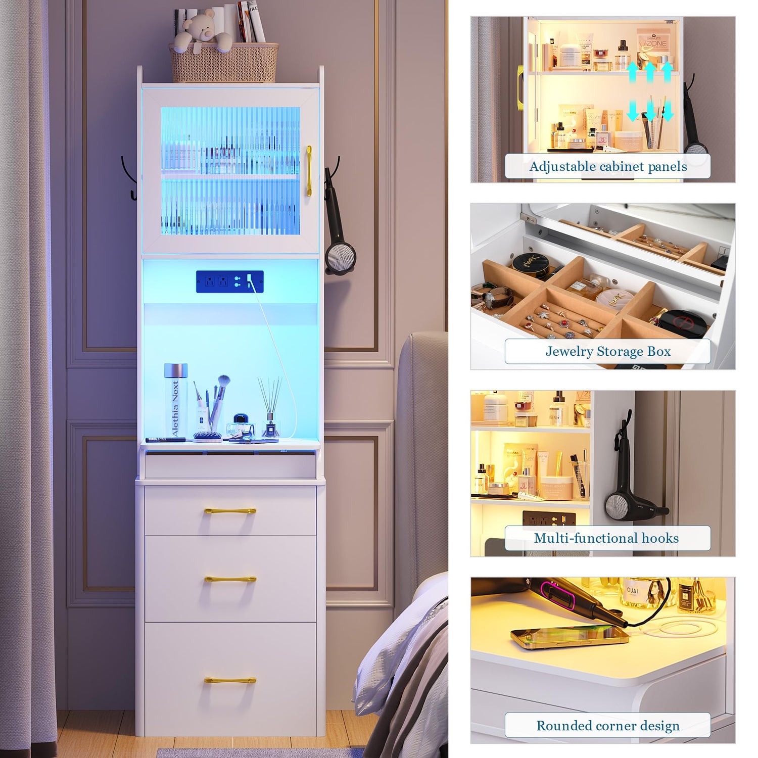 WOOVIVS Small Vanity Desk with Plip-up Mirror and Lights, Makeup Vanity Dresser with Charging Station, LED Vanities Dressing Table Set with Drawers&Stool for Bedroom,Checkroom (White,1PCS)