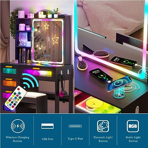 WOOVIVS Vanity Desk with Lights and Sliding Vanity Mirror, Makeup Vanity Desk with Charging Station, Vanities Dressing Table with Stool, LED Vanity Set with Large Drawers&Shelves for Bedroom, Black