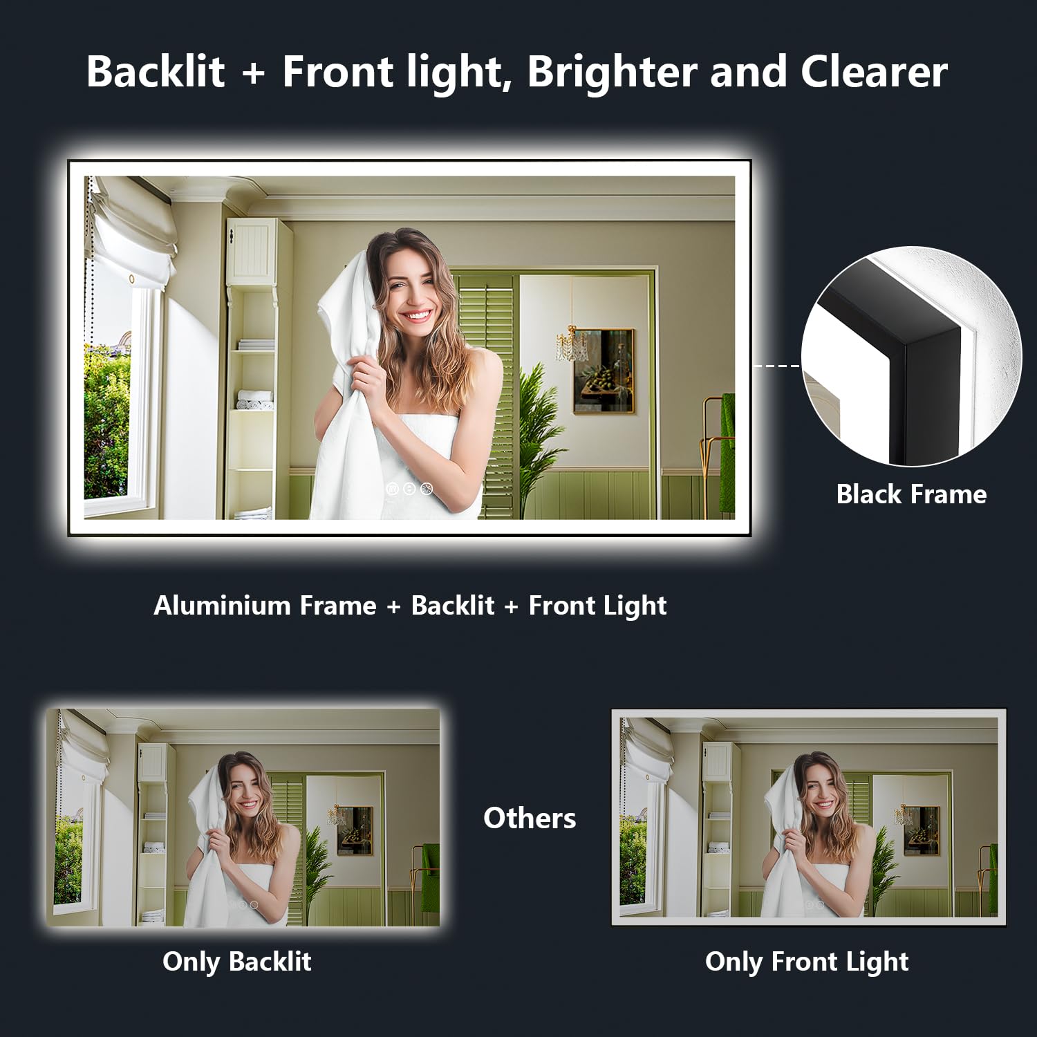 • 🔆【Backlit+Front Lit & Black Frame】- Designed with double lighting, our Led mirror for bathroom is twice or more brighter than ordinary lighted bathroom mirror. Bright enough for makeup, shaving or beauty care. The modern look of black frame is perfect for you to remodel and upgrade bathroom.