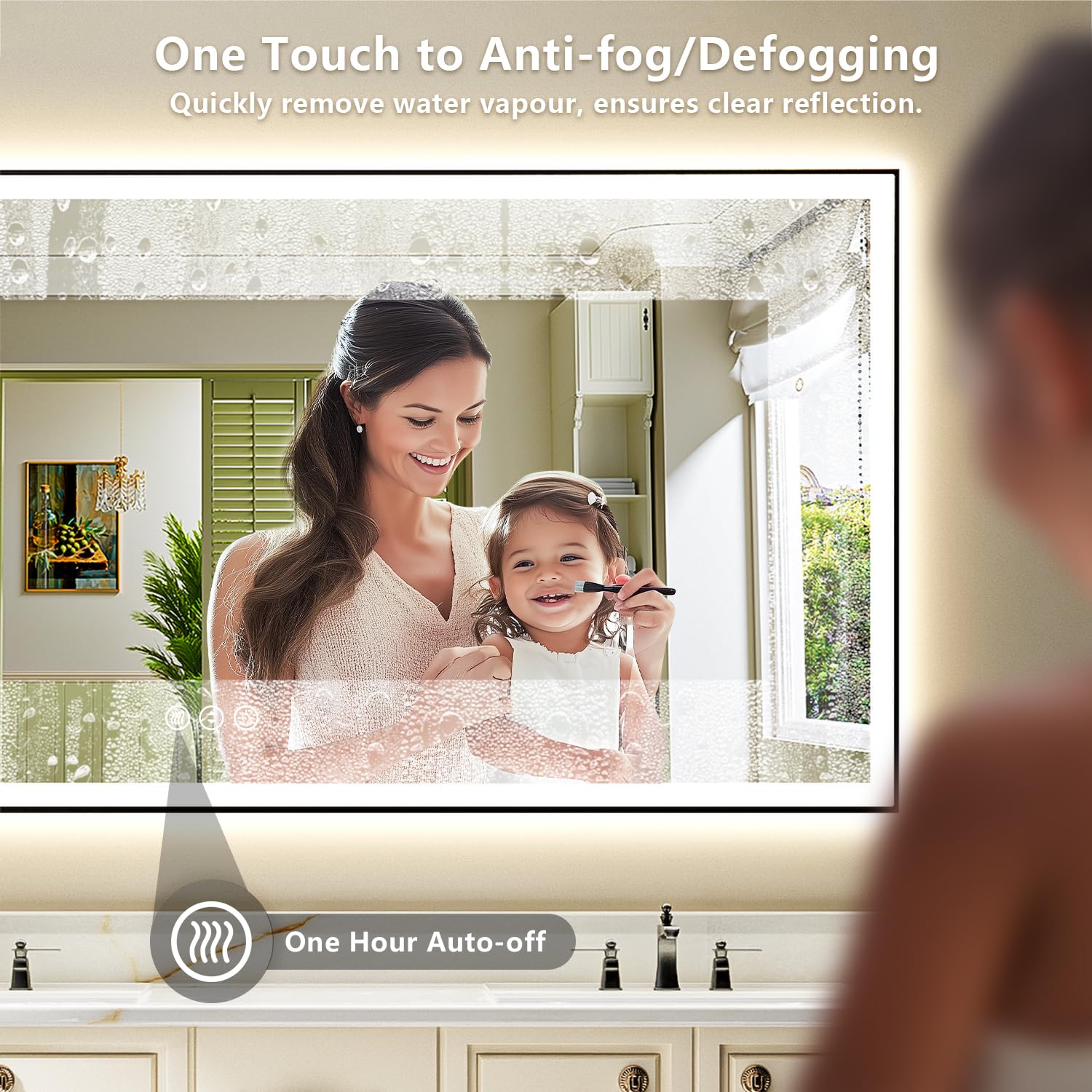 • 🔥【Anti-Fog/Defog, Clear Reflection】- Still troubled by the fog on the mirror after shower? This anti-fog lighted mirror can free you from this trouble. Turn on the defogger can quickly remove water vapor, always maintain a clear reflection. It will auto turn off after an hour. Long press the "Anti-fog" button can turn off the blue light of 3 buttons.