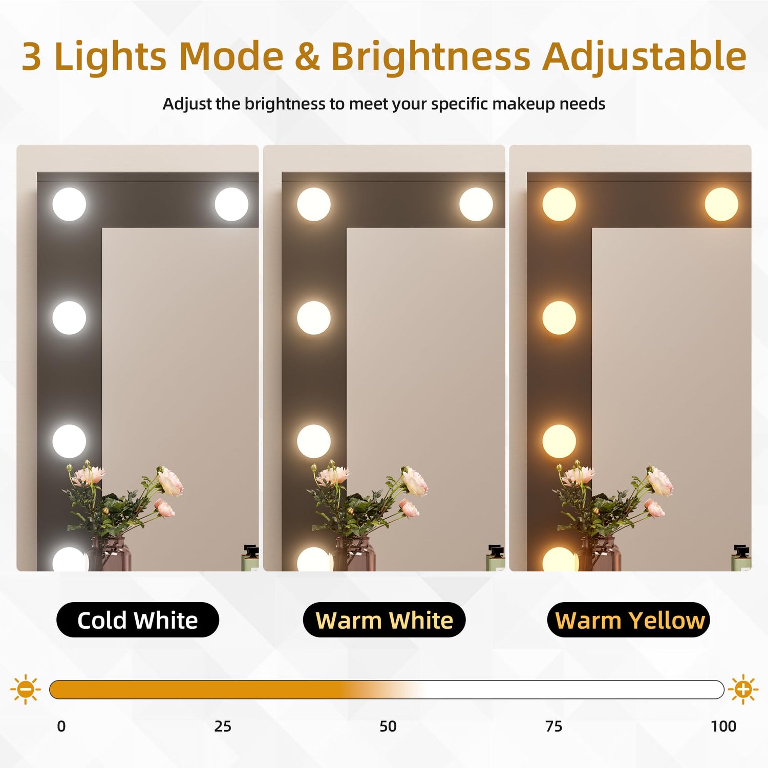 - Versatile Lighting with 11 LED Bulbs: Our vanity desk boasts 11 individual LED bulbs that offer three adjustable lighting modes and brightness settings. Whether you're applying makeup, styling your hair, or simply getting ready for the day, these lights provide the perfect illumination to enhance your beauty routine.
