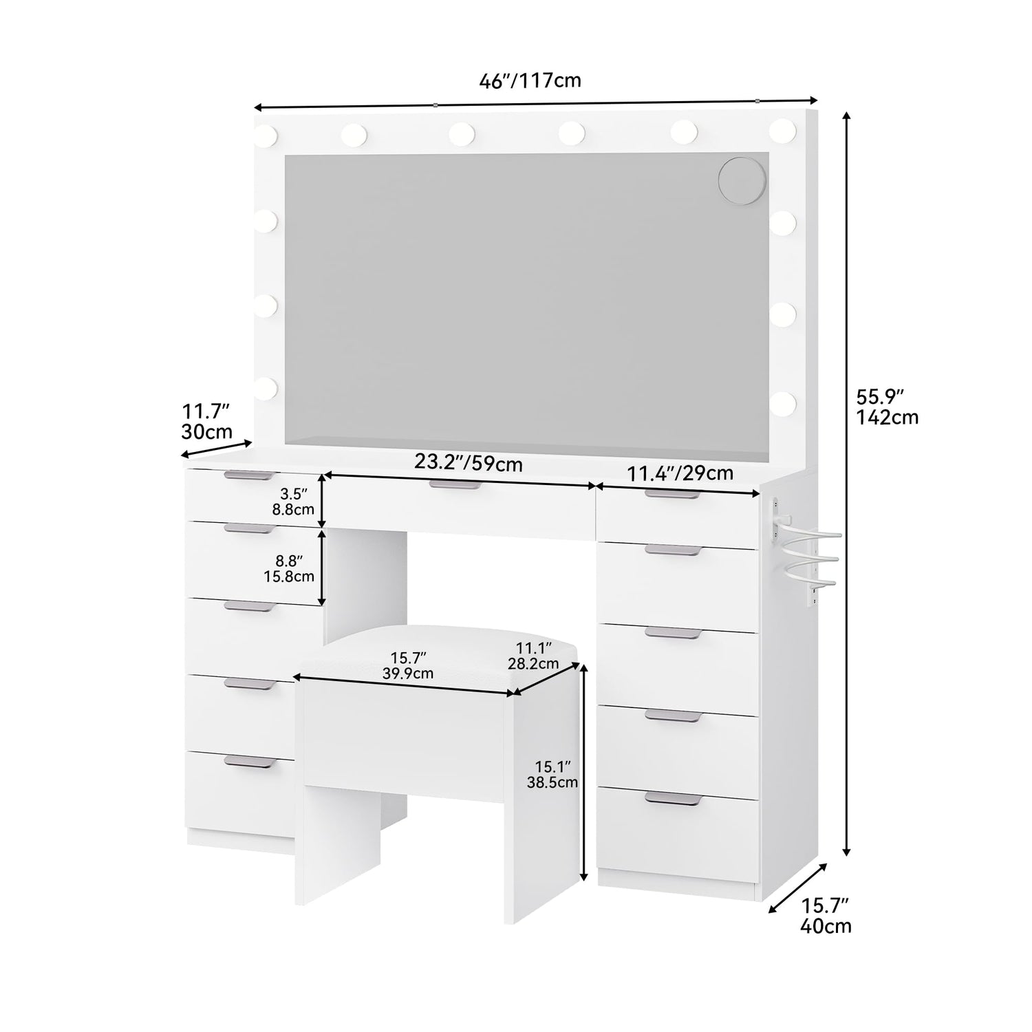 YITAHOME Makeup Vanity Desk with LED Mirror & 3 Brightness Levels, Makeup Table with 11 Drawers, Magnifying Glass, Power Outlets, Hairdryer Holder & Storage Cushion Stool for Dressing Room