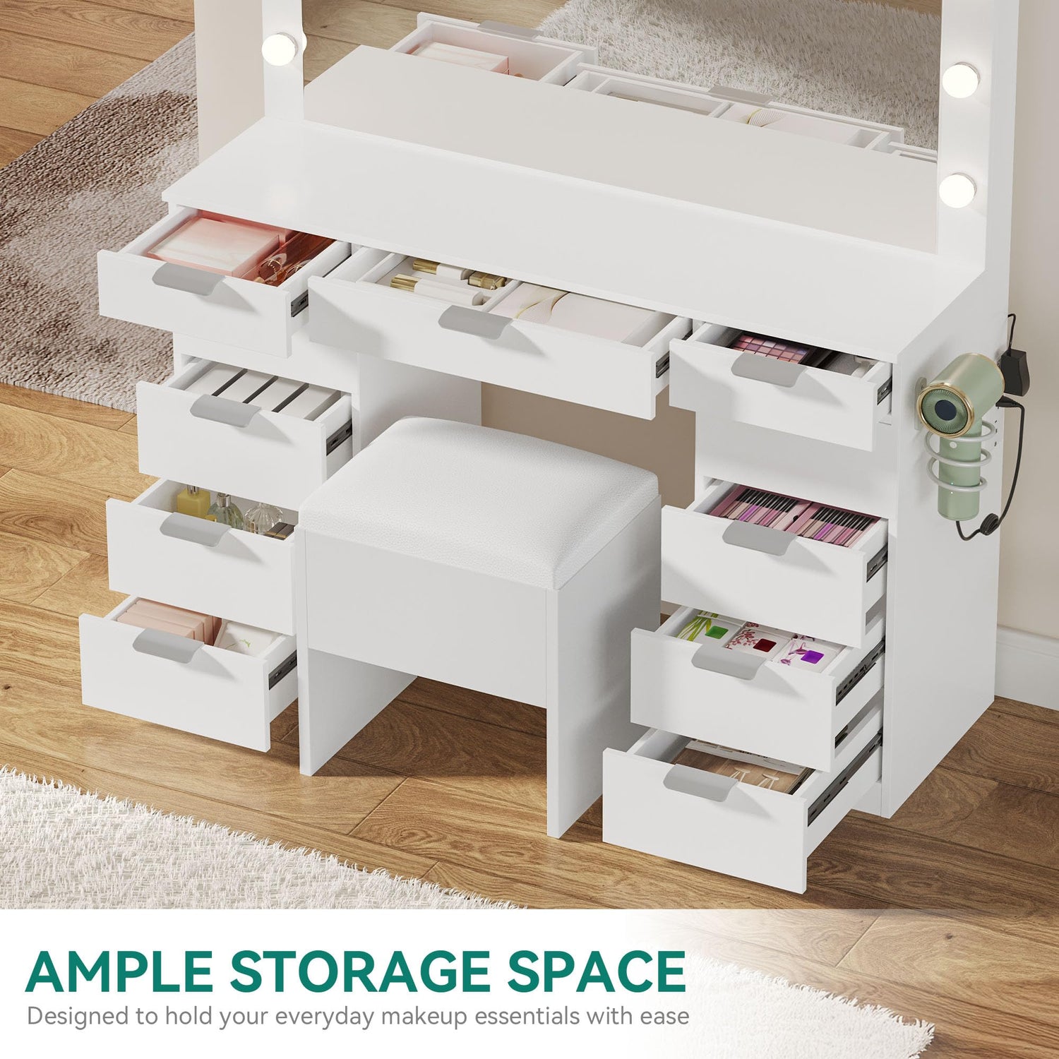 - Your Organized Beauty Corner: From palettes to serums and more, this vanity’s 11 drawers keep everything tidy and within reach. A cushioned stool with hidden storage adds comfort and extra space to your daily routine