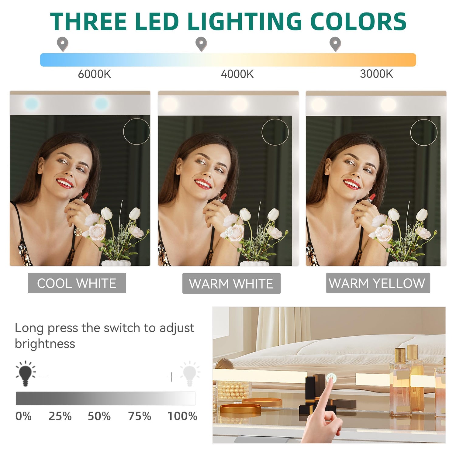 - Your Smart Beauty Mirror: Enjoy your skincare and makeup routine with this vanity desk featuring a mirror framed by 12 dimmable bulbs. Easily switch between cool, daylight, or warm light with a touch and use the magnifying mirror for precision